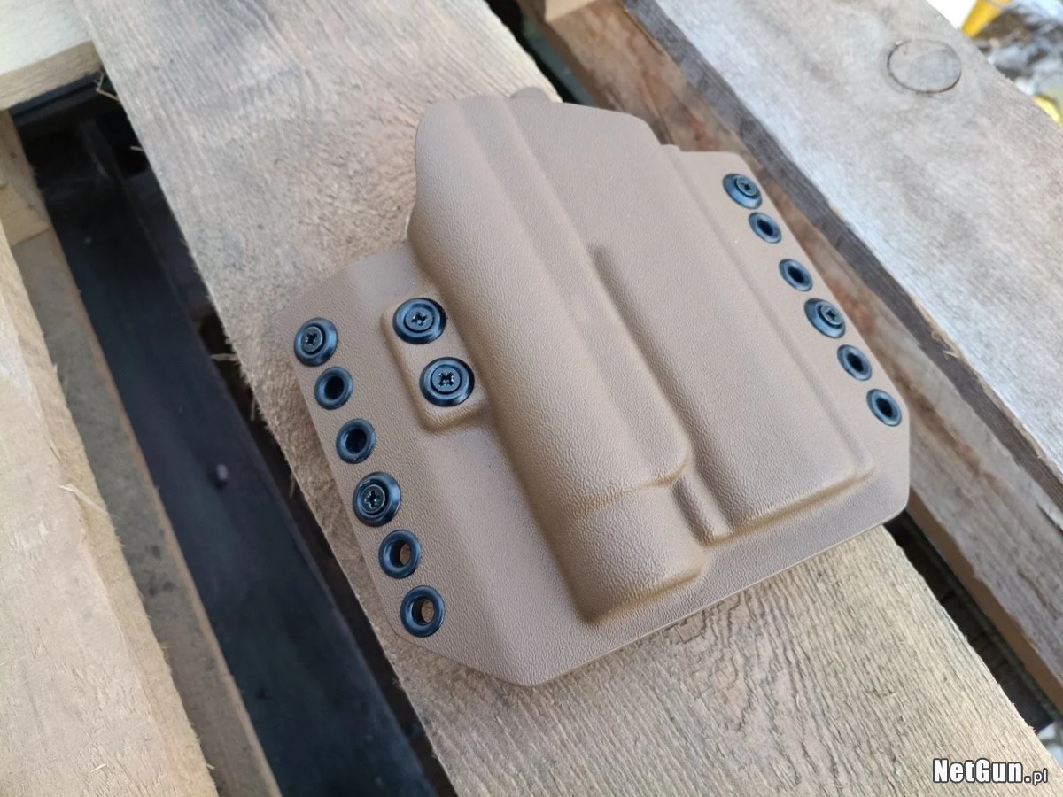 kabura Double Tap do Sig Sauer P320 / M17 w kolorze TAN z zamontowaną latarką Olight Valkyrie PL-2