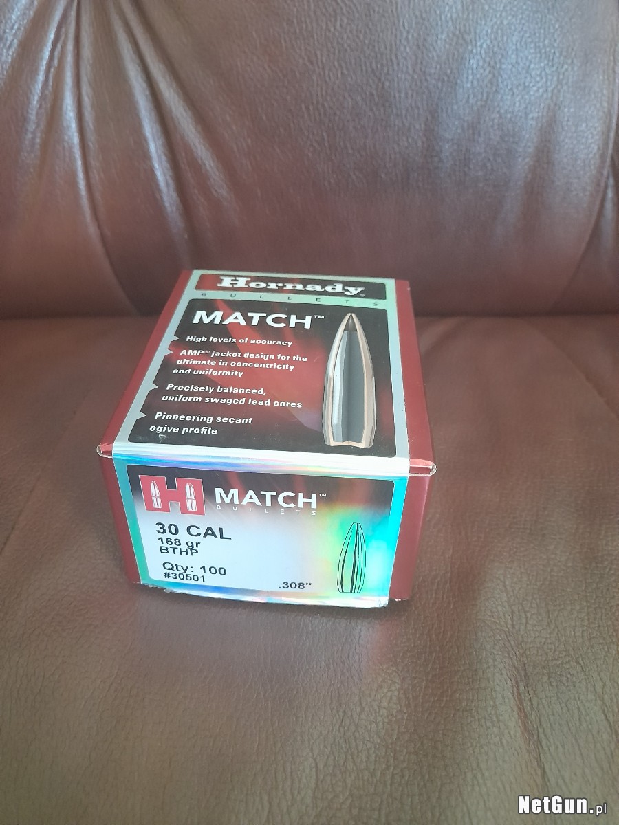 4. 100 sztuk pociski Hornady 308Win 168gr HPBT (bardzo dobre do lowiectwa i strzalow rekreacyjnych i dla gwintow 1:12",1:11", 1:10" do LongRange, potencjalny nabywca powinien sprawdzić, co będzie najlepiej latało dla jego lufy – skok gwintu, grubość i długość lufy) cena 150 zł.