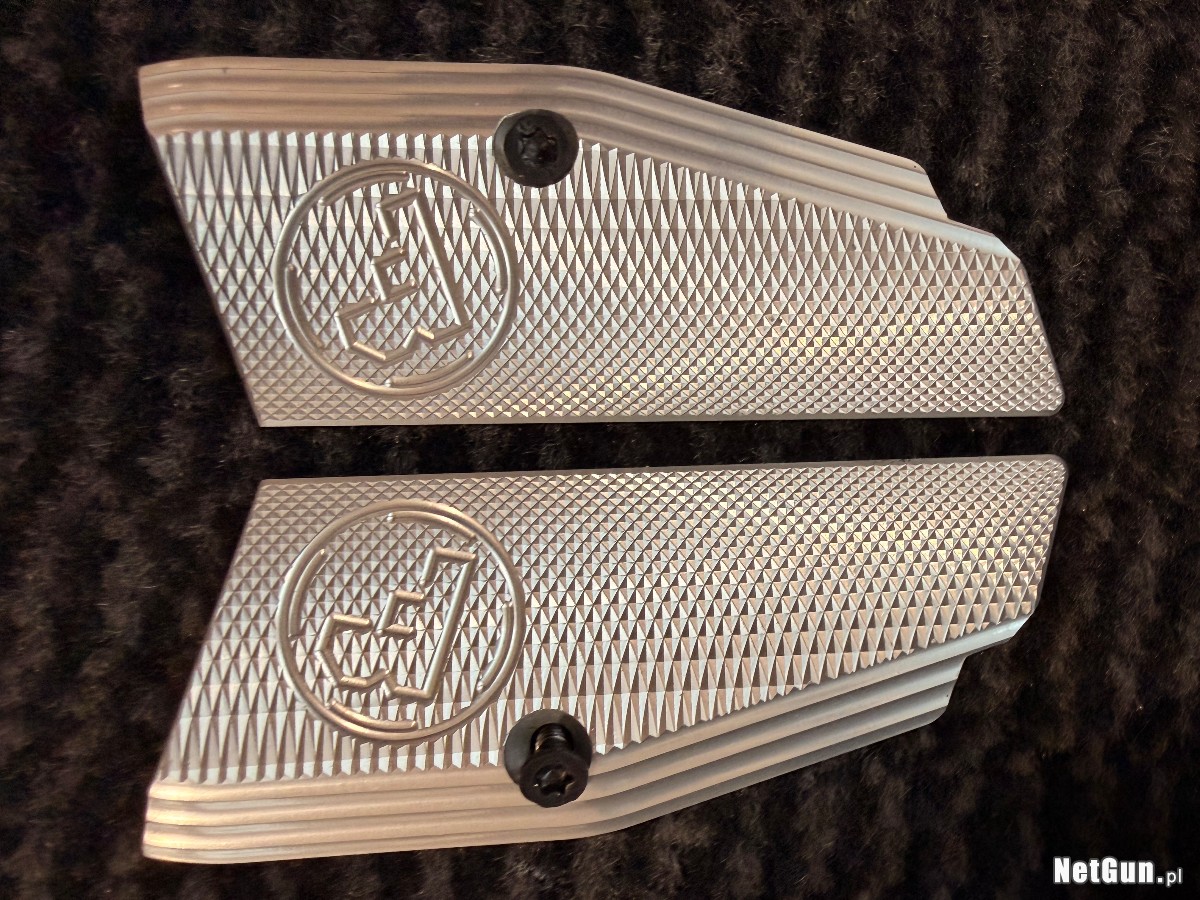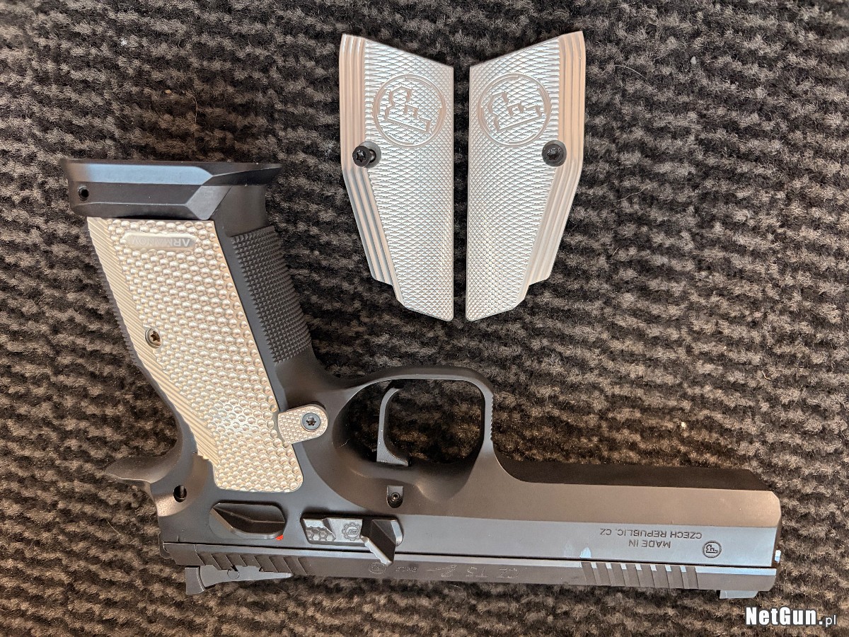 Prawie nowe, kupione w CZ PARTS okładziny aluminiowe oryginalne CZ pasują do CZ TS2 z lejkiem ( krótkie). Zmieniłem na grubsze L Armanov. Były założone przez miesiąc. Żadnego śladu zużycia. Zdjęcie z pistoletem poglądowe dla porównania, pistolet nie jest na sprzedaż.