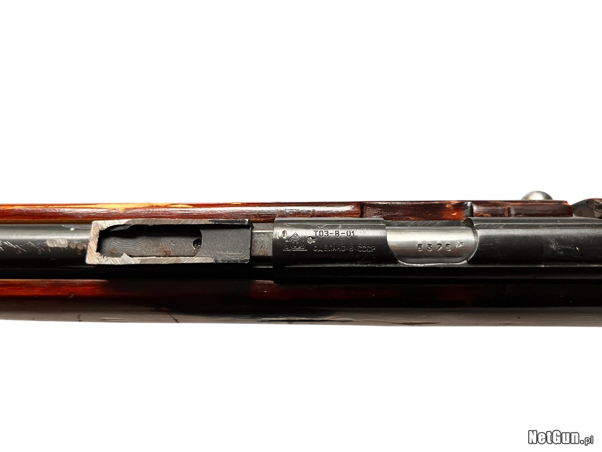 Radziecki karabin szkolno–treningowy TOZ 8-01 w kalibrze .22 LR, będący rozwinięciem popularnego modelu TOZ 8, szeroko stosowanego w klubach sportowych i szkoleniach paramilitarnych. Konstrukcja jednostrzałowa, prosta i niezawodna, ceniona za solidność wykonania oraz dobrą precyzję strzału. Prezentowany egzemplarz zachowany w stanie średnim – lufa w przyzwoitym stanie, jednak brak muszki i szczerbinki. Pomimo braków, karabin stanowi ciekawą propozycję do rekreacyjnego strzelania lub do odrestaurowania.