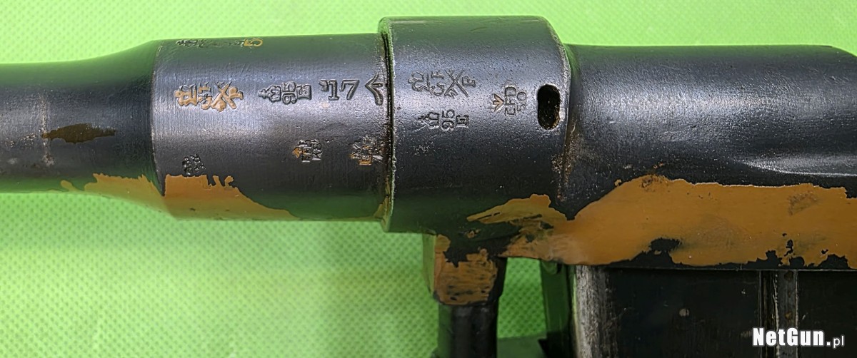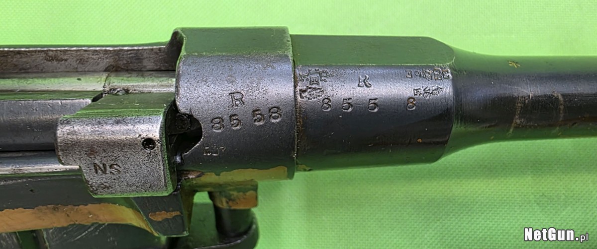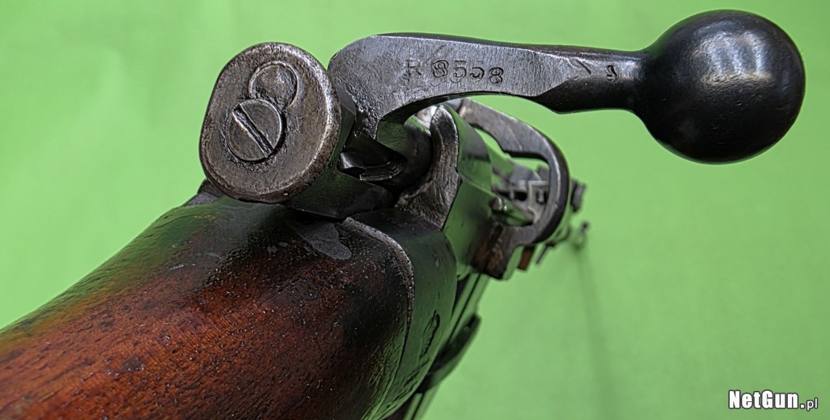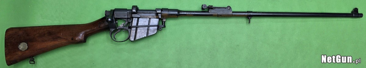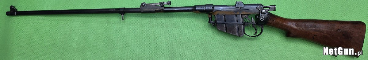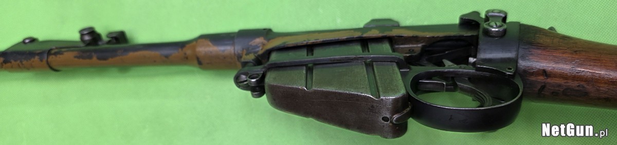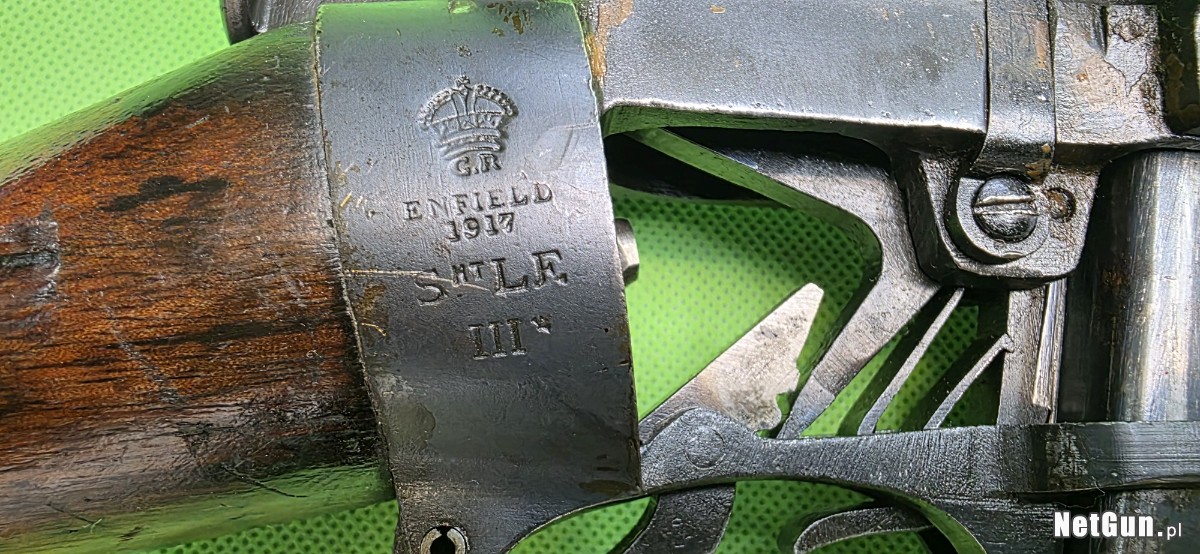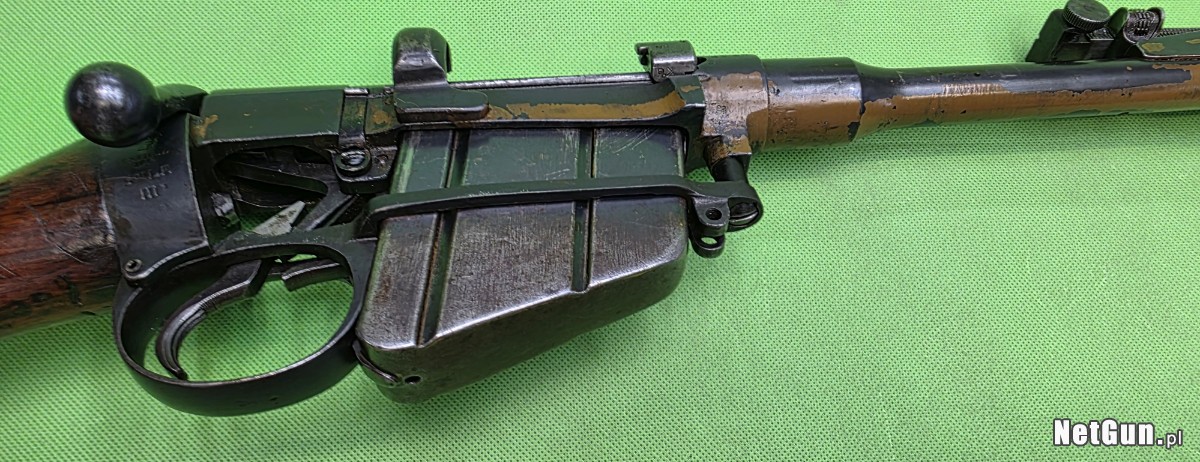 Legendarny, etatowy brytyjski karabin powtarzalny, wprowadzony do produkcji niedługo po wybuchu I wojny światowej – w 1915 r. Oferowany egzemplarz pochodzi z 1917 r. więc stanowi cenny artefakt z tamtego okresu. Brakuje w nim jednak: dolnego łoża, nakładki lufy, bączka, osłony muchy zintegrowanej z szyną montażową bagnetu, a także stopki kolby. Karabin niemniej w całości zgodny numerycznie, pięknie oznakowany wyłącznie fabrycznymi / brytyjskimi odbiorami (brak jakichkolwiek obcych atestów, czy oznakowań importowych). Częściowo zachowana oryginalna, oliwkowa farba zabezpieczająca antykorozyjnie metalowe części. Przewód lufy w bardzo dobrym stanie – gwint pełny i wyraźny na całej długości. W komplecie jeden oryginalny magazynek.