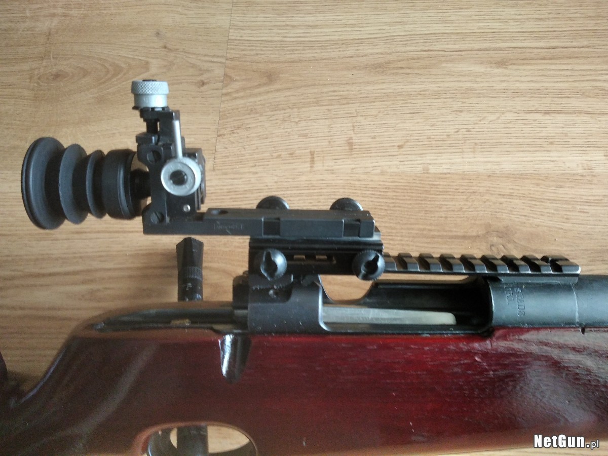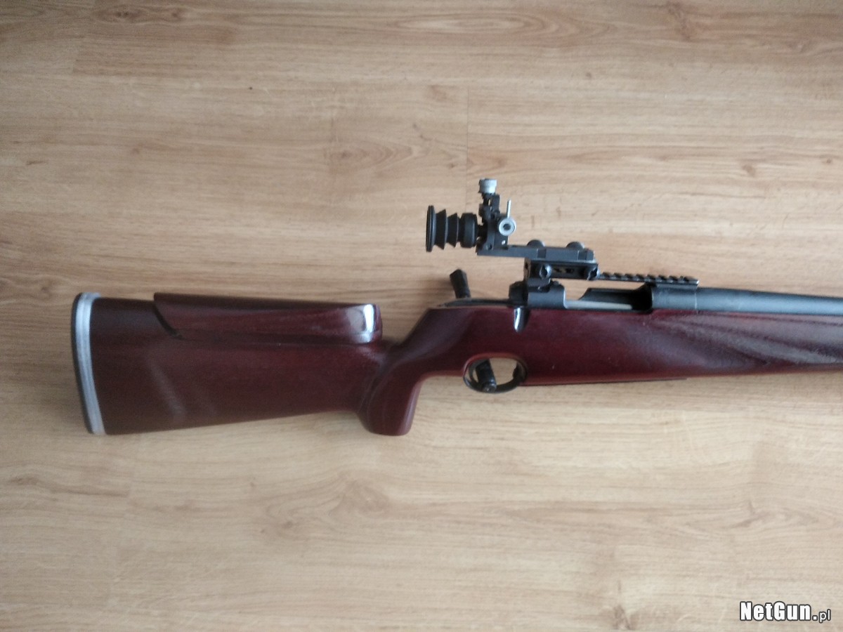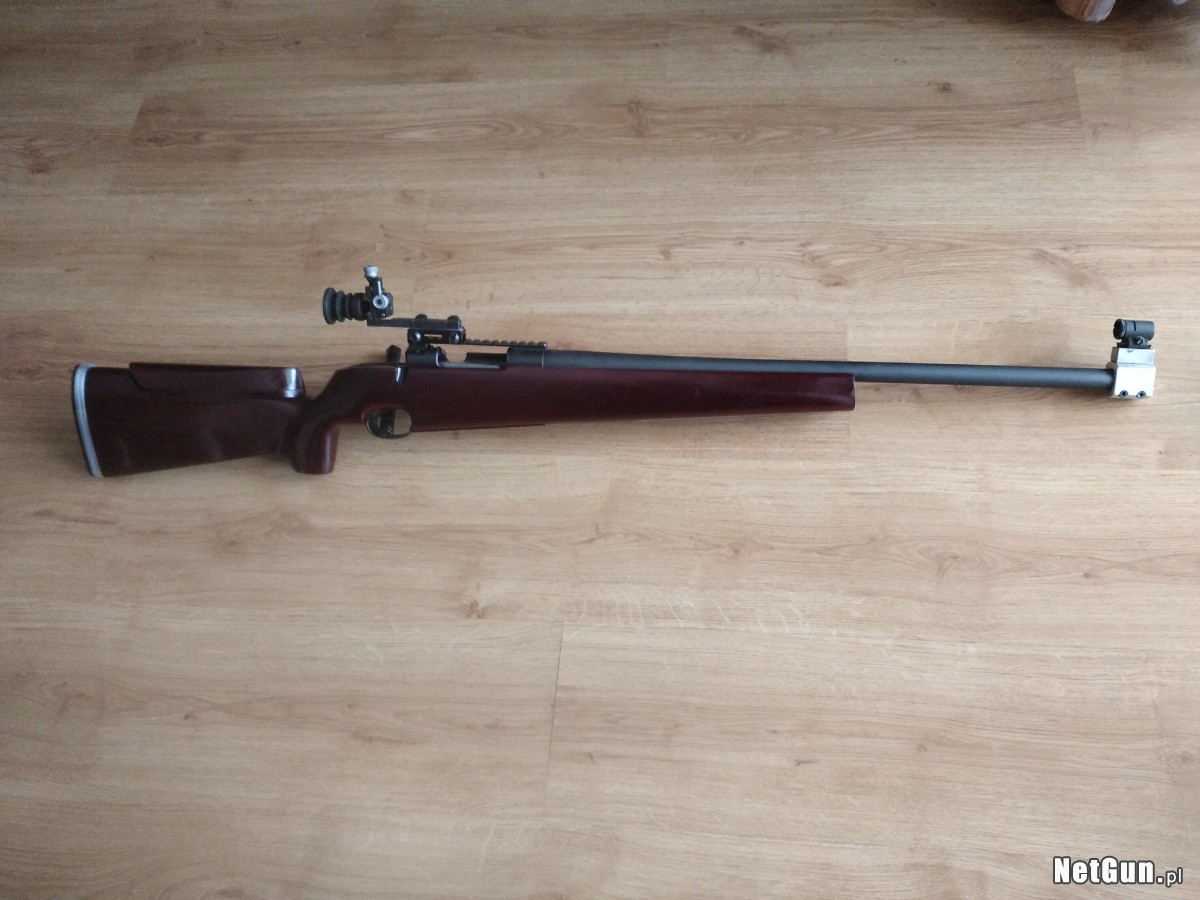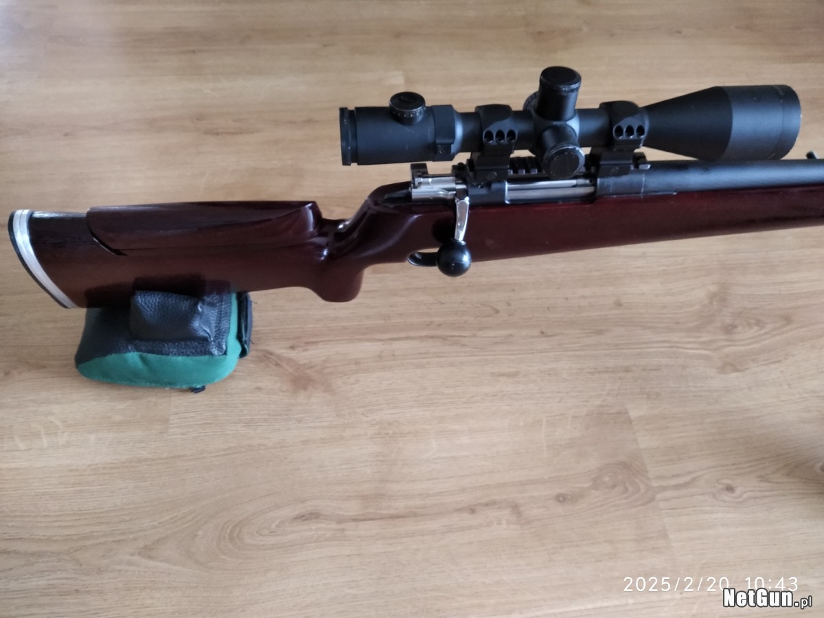 Carl Gustaf kal. 6,5x55 z precyzyjnymi przyrządami celowniczymi firmy Anschutz, gdzie 1 klik to 5 mm na 100 m. Są to współczesne przyrządy, które z łatwością można modyfikować i doposażać w irysy z regulacją, filtrami itd. Gruba precyzyjna lufa o dł 65 cm i gr 23 mm przy wylocie. Stan lufy doskonały, nominał, mierzony oryginalnym miernikiem. Broń posiada bardzo czuły regulowany spust Timney, obecnie ustawiony na ok 200 gram, szyna UIT. Na karabin można też w łatwy sposób zamontować lunetę i strzelać konkurencje snajperskie, ponieważ ma zamontowaną szynę Picatinny. Możliwość dowozu.