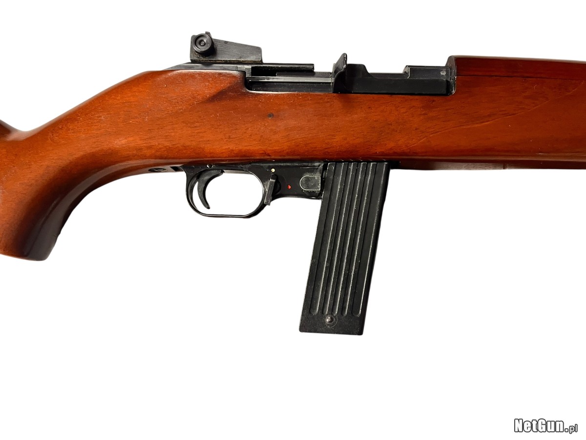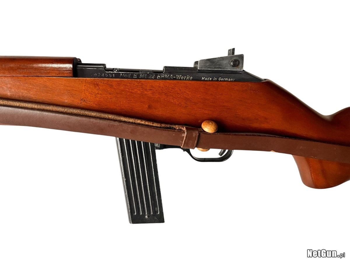 Karabin samopowtarzalny Erma EM1 .22 to niemiecka broń rekreacyjno-sportowa w kalibrze .22 LR stylizowana na legendarny amerykański karabinek wojskowy M1 Carbine z okresu II wojny światowej. Produkowany w RFN przez firmę ERMA-Werke model stanowi cywilną wersję treningową, zachowując charakterystyczny wygląd i ergonomię oryginału przy wykorzystaniu taniej amunicji bocznego zapłonu. Karabin charakteryzuje się lekką konstrukcją, prostym i niezawodnym mechanizmem samopowtarzalnym oraz wygodą użytkowania. Idealnie sprawdza się w strzelectwie rekreacyjnym oraz jako ciekawa pozycja kolekcjonerska dla miłośników broni historycznej. W zestawie pas nośny. Stan: Dobry +