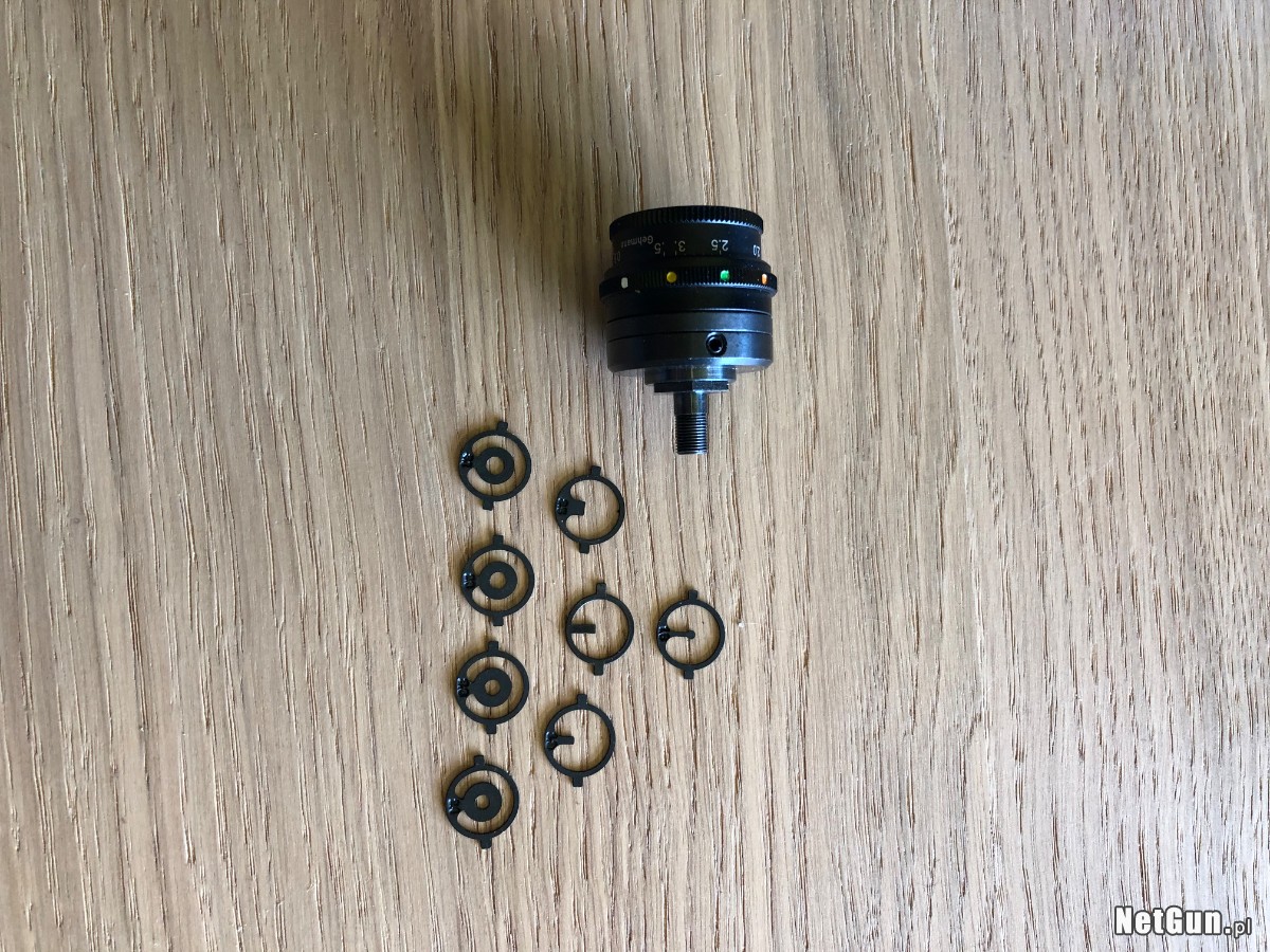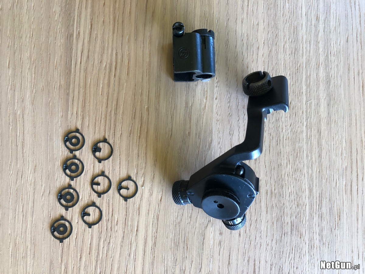 1/. oryginalny diopter mikrometryczny z regulacją średnicy przeziernika + mucha tunelowa z 8 insertami /4 słupkowe + 4 kołowe/.
