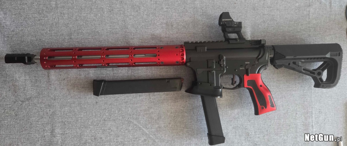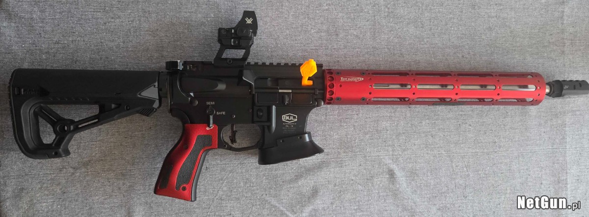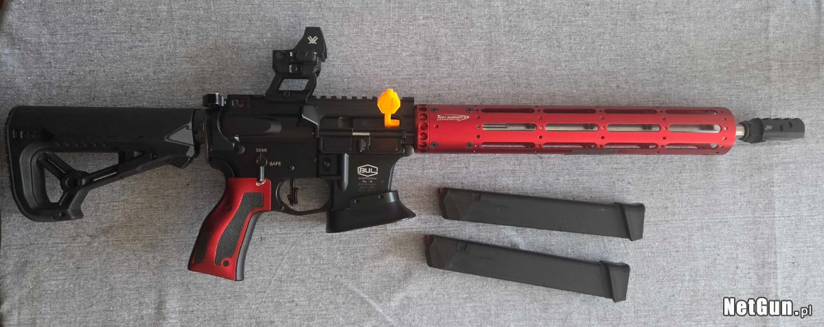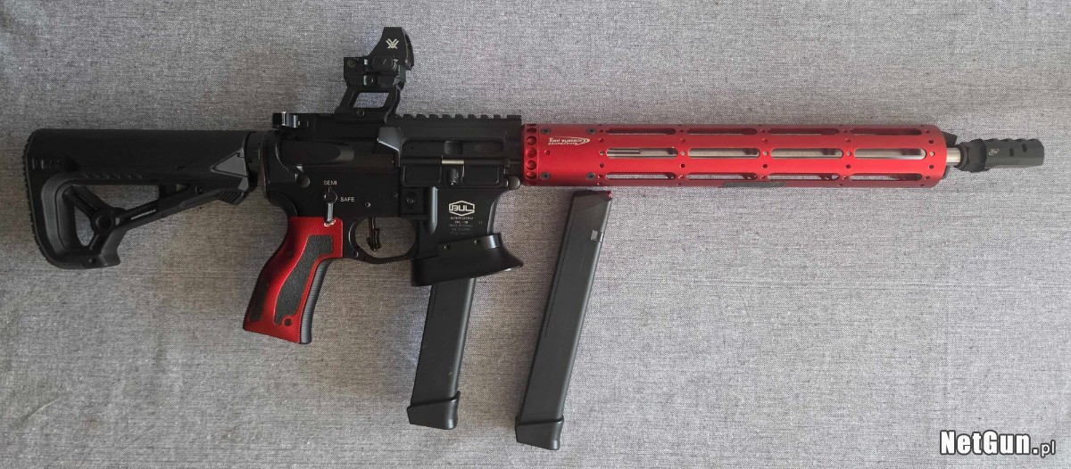 BUL Armory BL-9, lufa 14.5 cala, czarny, kaliber 9x19. Zainstalowane modyfikacje to między innymi: czerwone łoże, rękojeść, kompensator oraz kolba, wszystkie wymienione komponenty są od Toni System. Do karabinku dorzucam 2 magazynki, wszystkie pozostałe części oryginalne również posiadam. Broń w stanie idealnym. Zestaw jest sprzedawany bez kolimatora. W celu uzyskania większej ilości informacji proszę o kontakt telefoniczny pod nr.: 607439966.