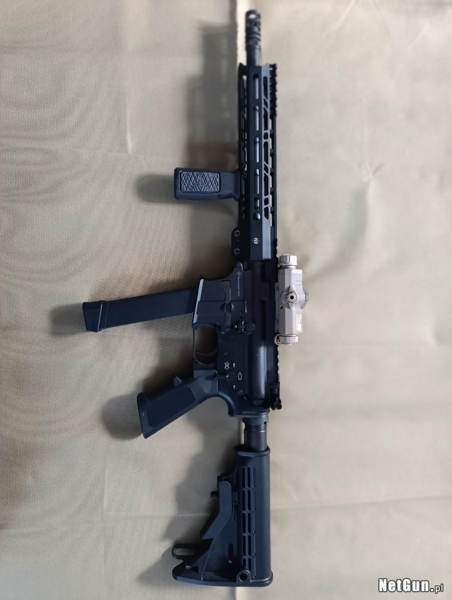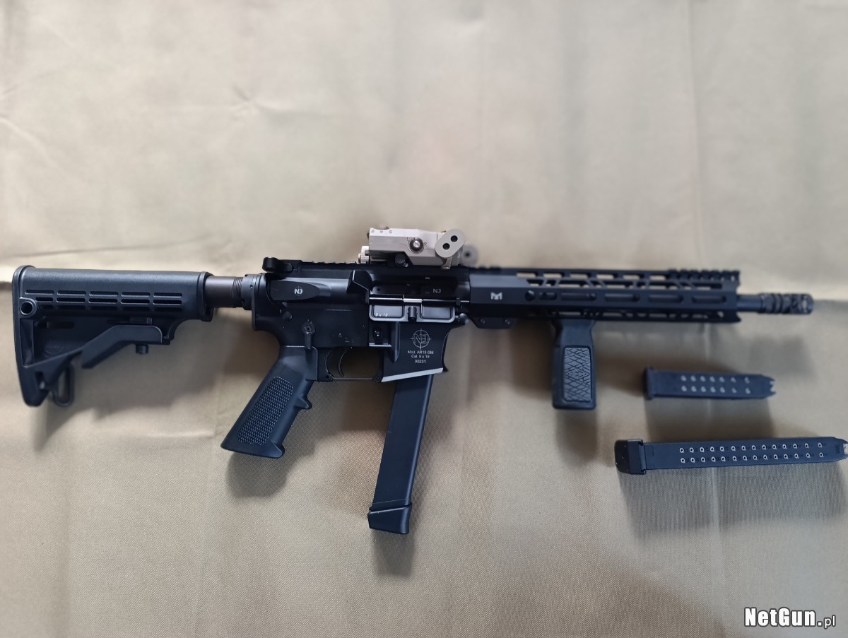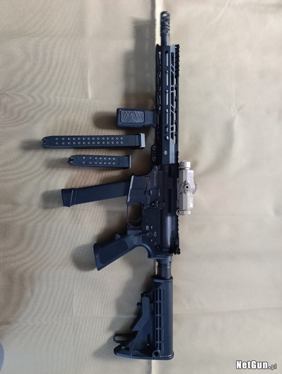 Sprzedam karabin kal. 9 mm na platformie AR 15. , W komplecie 3 magazynki, długość lufy 10,5 cala, lufa kuta na zimno. Łoże M-Loc ułatwiające montaż oświetlenia. Stan idealny. Używany sporadycznie. Nalot to kilkaset szt.amo. Cena do rozsądnej negocjacji.
