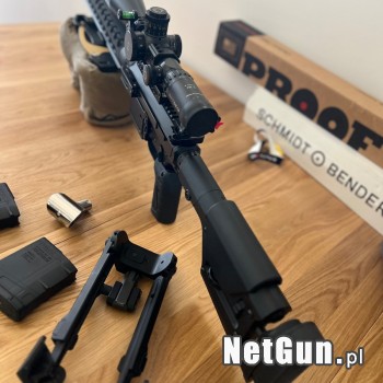 Haenel cr223 12,5 cala Regulowany blok gazowy Moderator dźwięku b&T M.A.R.S QD Urządzenie wylotowe/ Kompensator b&T M.A.R.S Kolba magpul Przyrządy mechaniczne. Handstop magpul W zestawie znajduje się dodatkowo Chwyt pionowy magpul Kolba Haenel Oryginalny blok gazowy. Oryginalne urz...