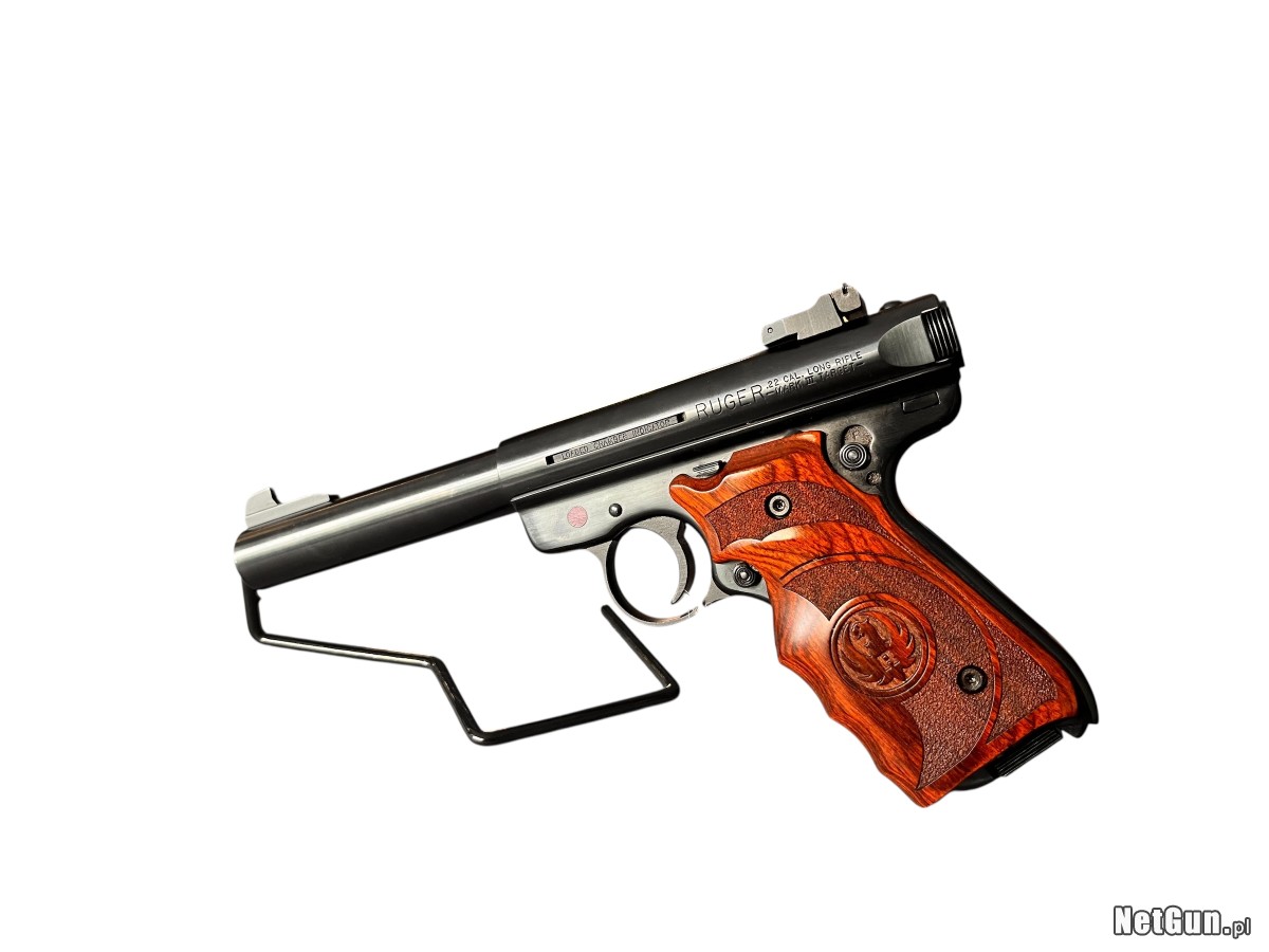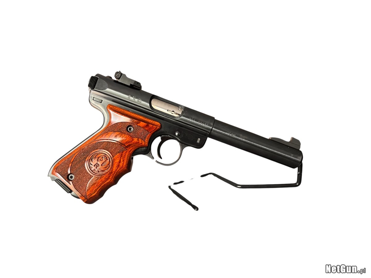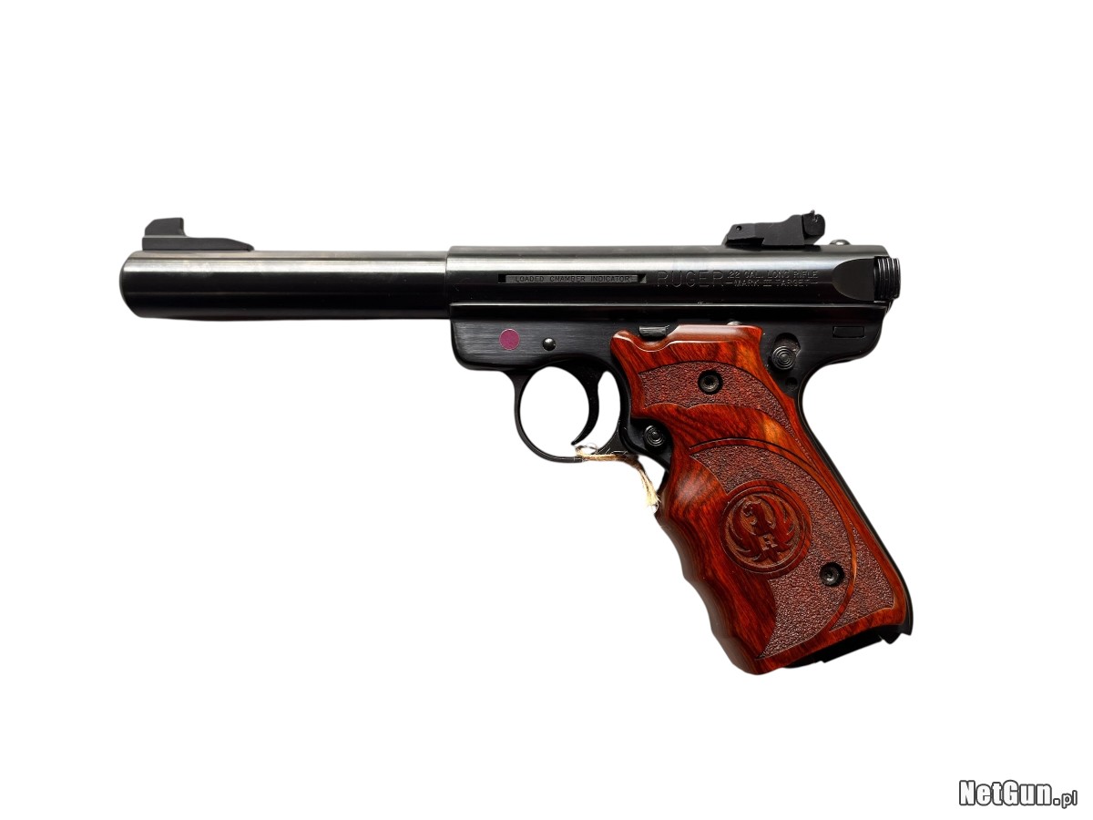 Na sprzedaż precyzyjny pistolet sportowy Ruger MARK III Target w kalibrze .22 LR. To trzecia generacja legendarnej amerykańskiej serii pistoletów bocznego zapłonu, produkowana w latach 2004-2016. Wersja Target charakteryzuje się grubą, ciężką lufą typu „bull barrel”, która zapewnia wyjątkową stabilność i celność. Posiada w pełni regulowane przyrządy celownicze, idealne do strzelania tarczowego. Ten egzemplarz wyposażono w eleganckie, drewniane okładziny chwytu, które poprawiają ergonomię. Stan idealny. W zestawie pełen komplet fabryczny: pudełko, kłódka i dodatkowy magazynek.