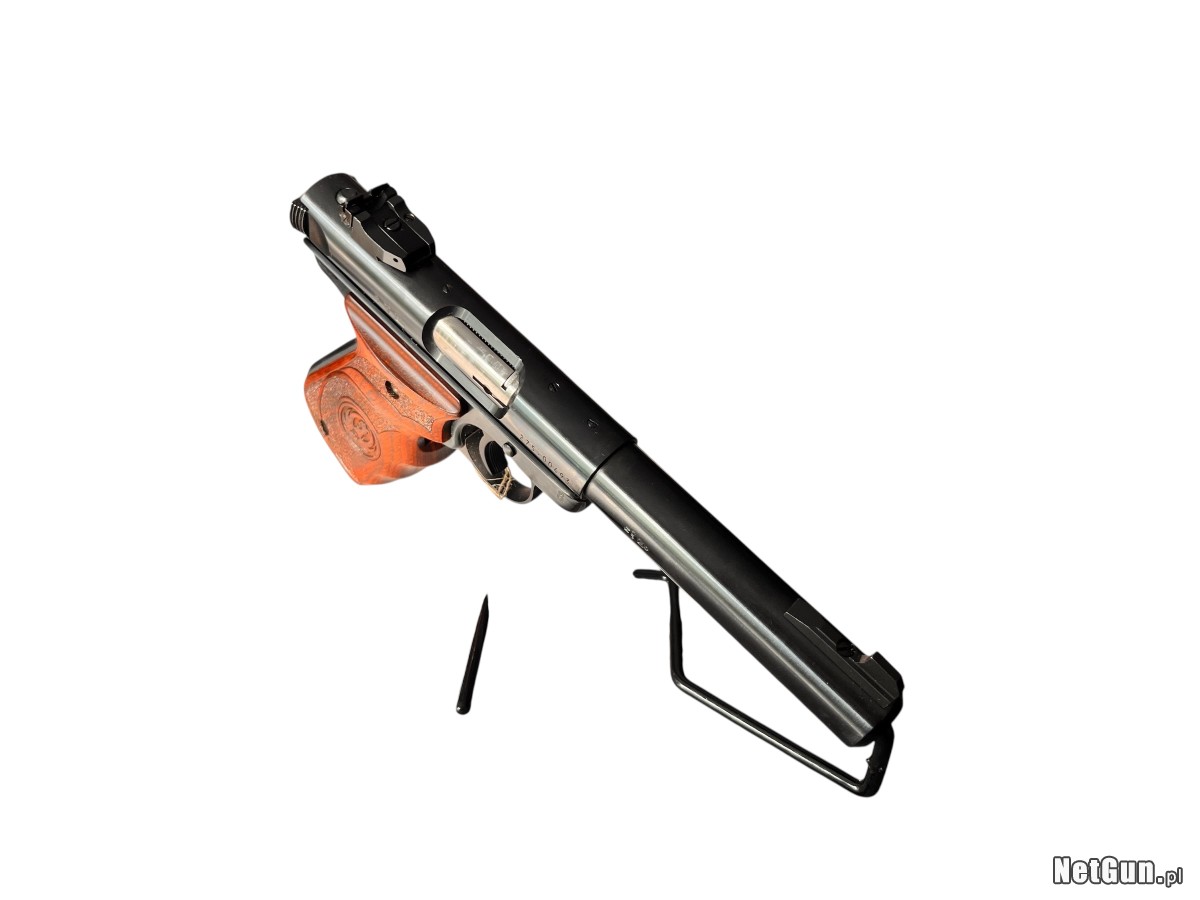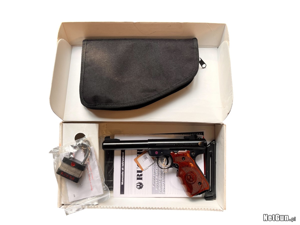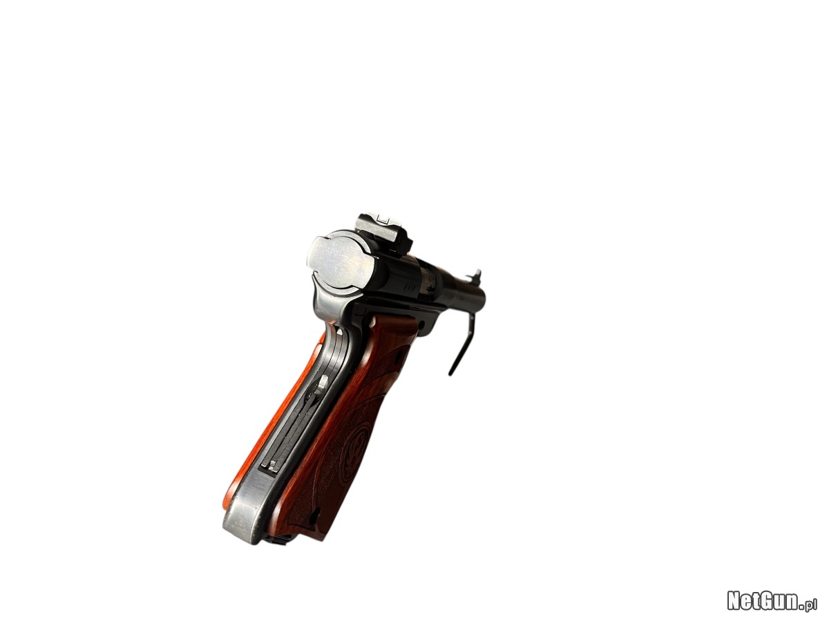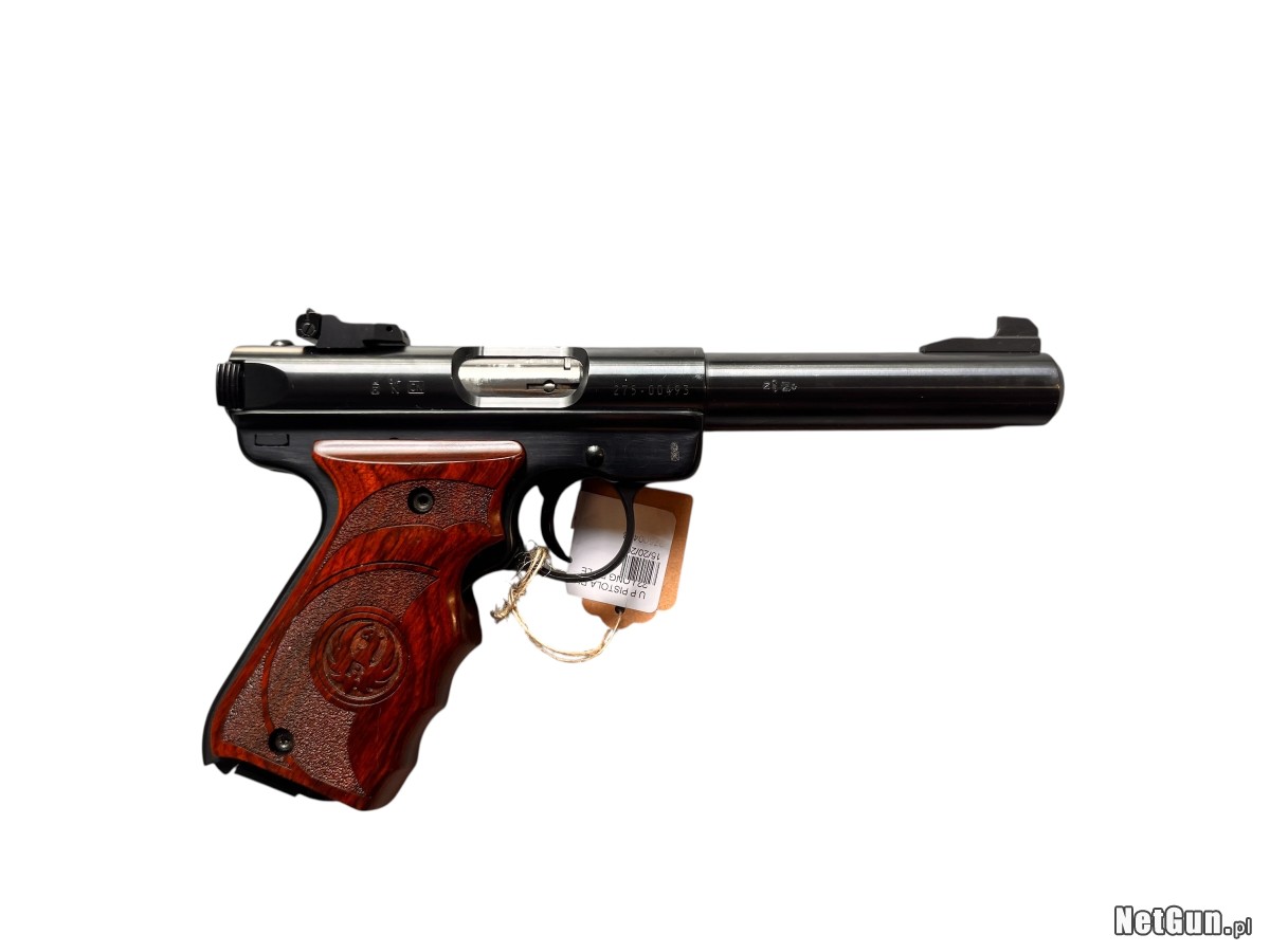 Na sprzedaż precyzyjny pistolet sportowy Ruger MARK III Target w kalibrze .22 LR. To trzecia generacja legendarnej amerykańskiej serii pistoletów bocznego zapłonu, produkowana w latach 2004-2016. Wersja Target charakteryzuje się grubą, ciężką lufą typu „bull barrel”, która zapewnia wyjątkową stabilność i celność. Posiada w pełni regulowane przyrządy celownicze, idealne do strzelania tarczowego. Ten egzemplarz wyposażono w eleganckie, drewniane okładziny chwytu, które poprawiają ergonomię. Stan idealny. W zestawie pełen komplet fabryczny: pudełko, kłódka i dodatkowy magazynek.