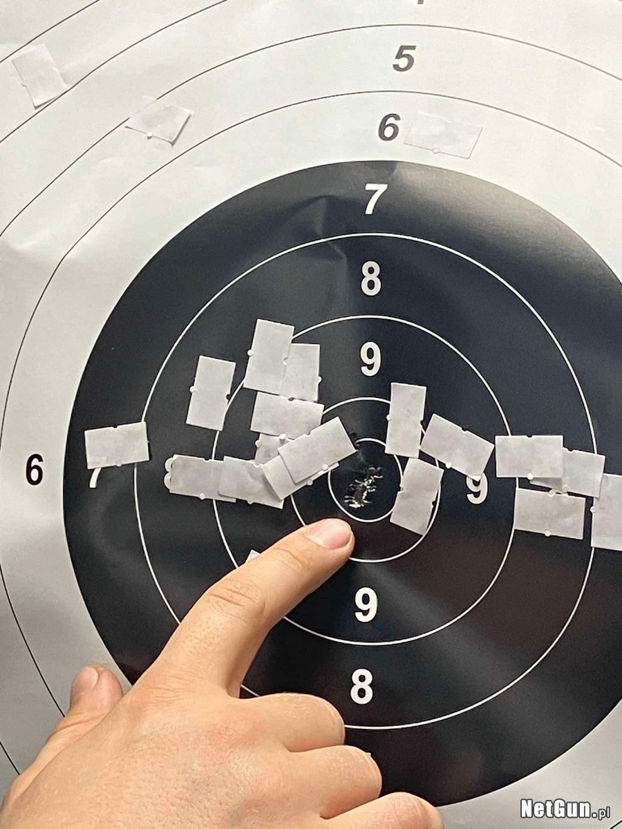 Karabinek jest świetnie i płynnie pracującą, bardzo celną, bezawaryjną i wydajną jednostką do nauki i rekreacji. Po odpowiednim ustawieniu lunety, na 25 m. przestrzeliny układają się w wielkości monety o nominale 1 zł. jak na załączonym zdjęciu (5 strzałów). Jednostka testowana przeze mnie także na 50 i 100 m. prezentowała bardzo dobre skupienie. Z odpowiednim urządzeniem wylotowym wyjątkowo cicho pracująca.