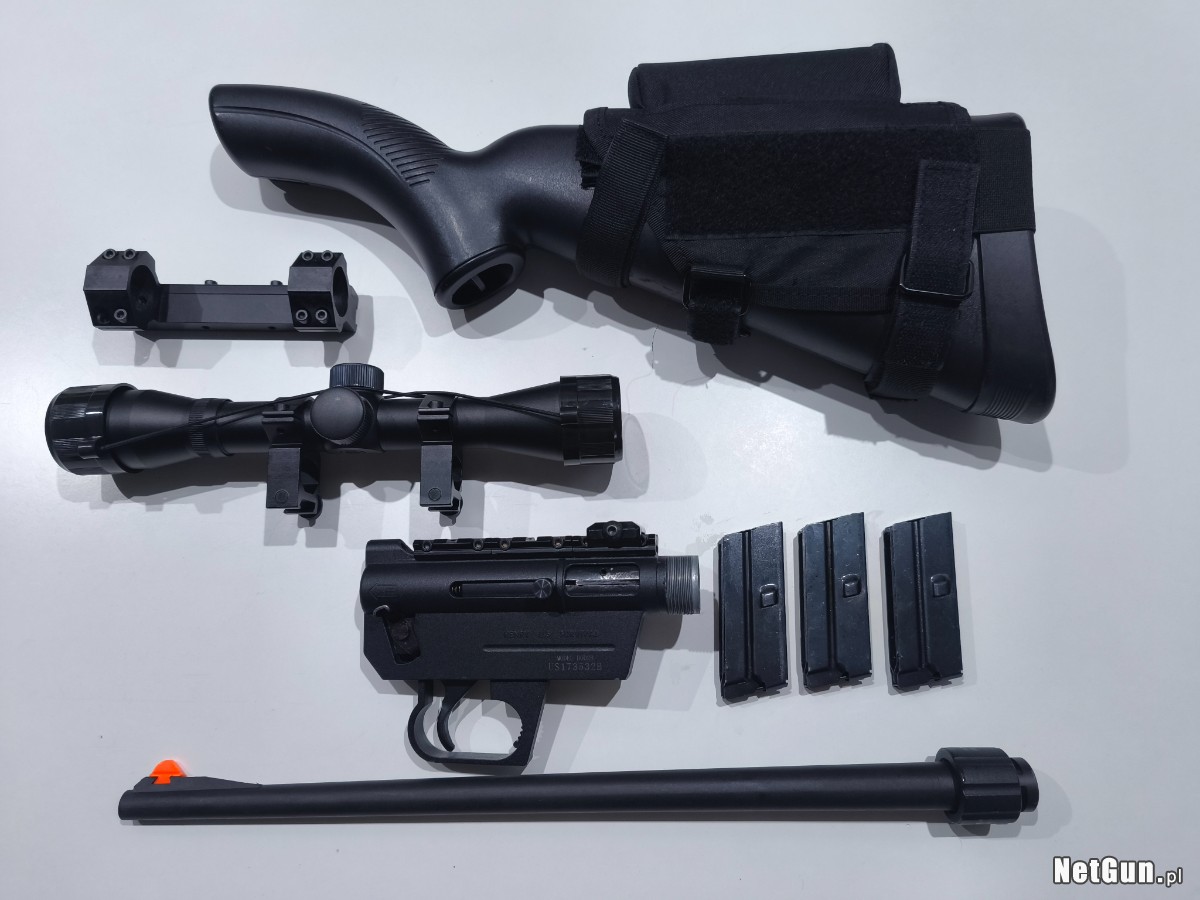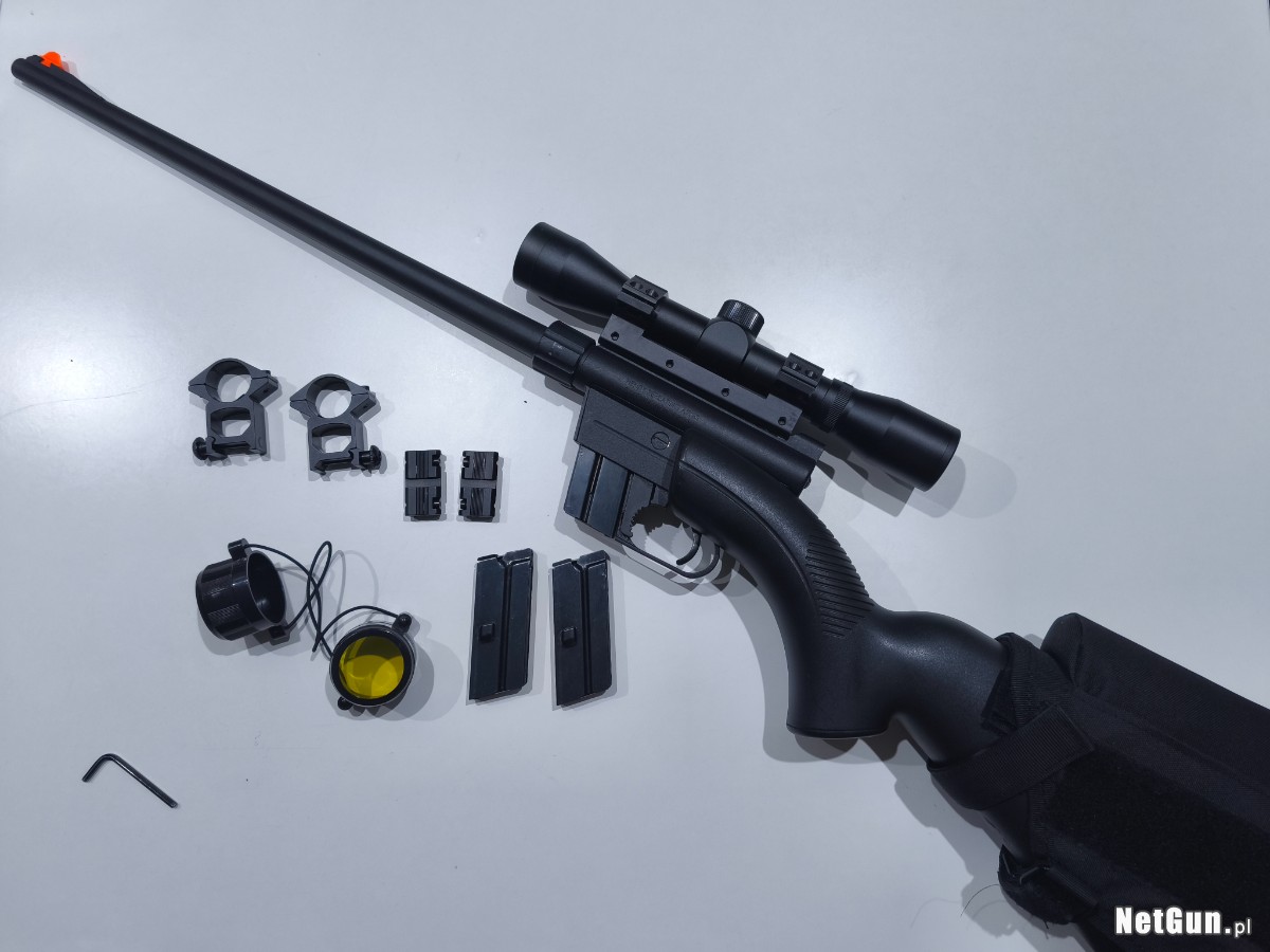 W zestawie dodatkowo 3 magazynki, luneta, mocowania pod optykę (wysokie i niskie), nakładka na Kolbe z baką ułatwiająca celowanie oraz sznur do czyszczenia lufy.