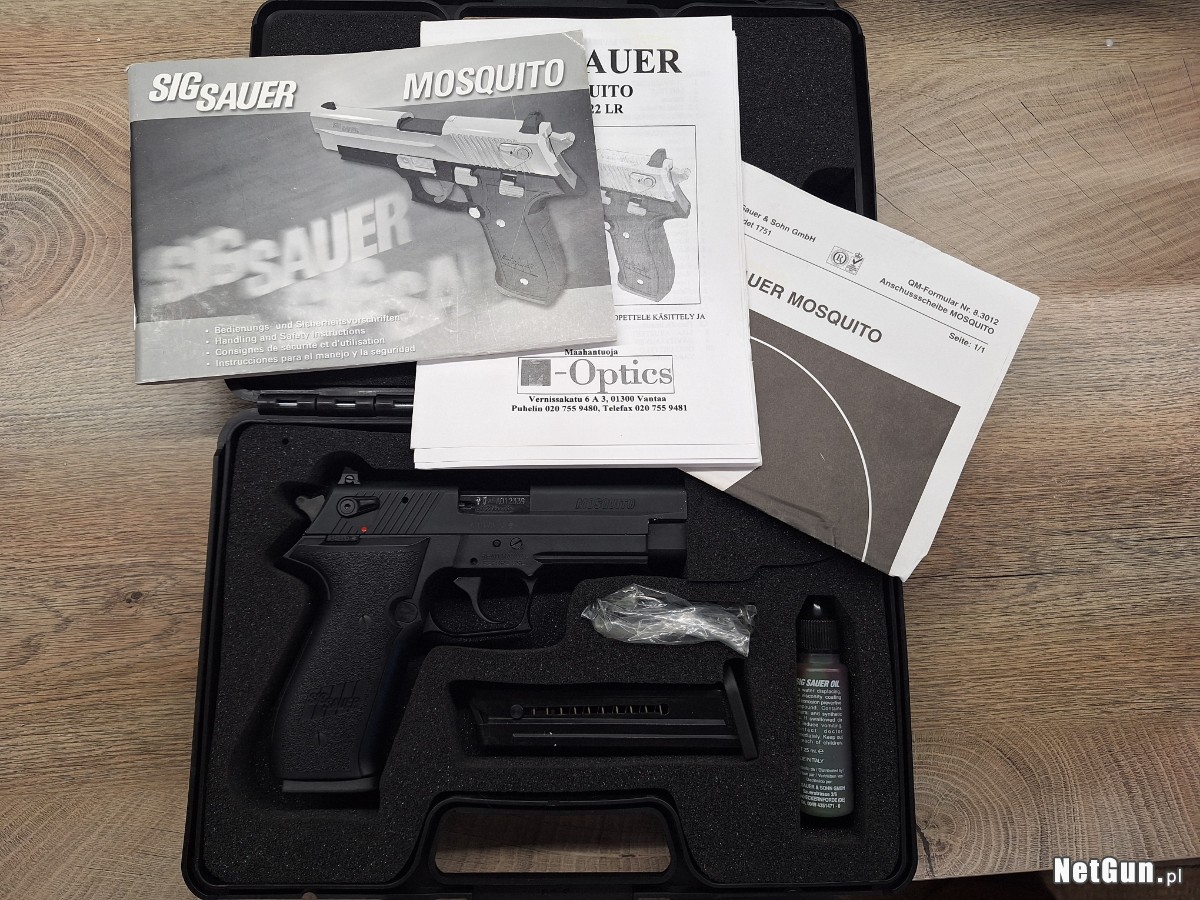 Sprzedam pistolet SIG-Sauer Mosquito samopowtarzalny, kaliber 22 LR. To pomniejszona o około 10 procent wersja modelu P226. Dzięki mniejszym wymiarom i ergonomicznemu chwytowi jest idealny zarówno dla początkujących jak i doświadczonych strzelców. Pistolet wyposażony jest w szynę Picatinny do montażu dodatkowych akcesoriów. Oferowanych egzemplarz znajduje się w bardzo dobrym stanie . W zestawie dwa magazynki 10-cio nabojowe, oryginalne opakowanie i zestaw fabrycznych dokumentów.Chętnie rozważę zamianę na karabin w kalibrze 22lr.
