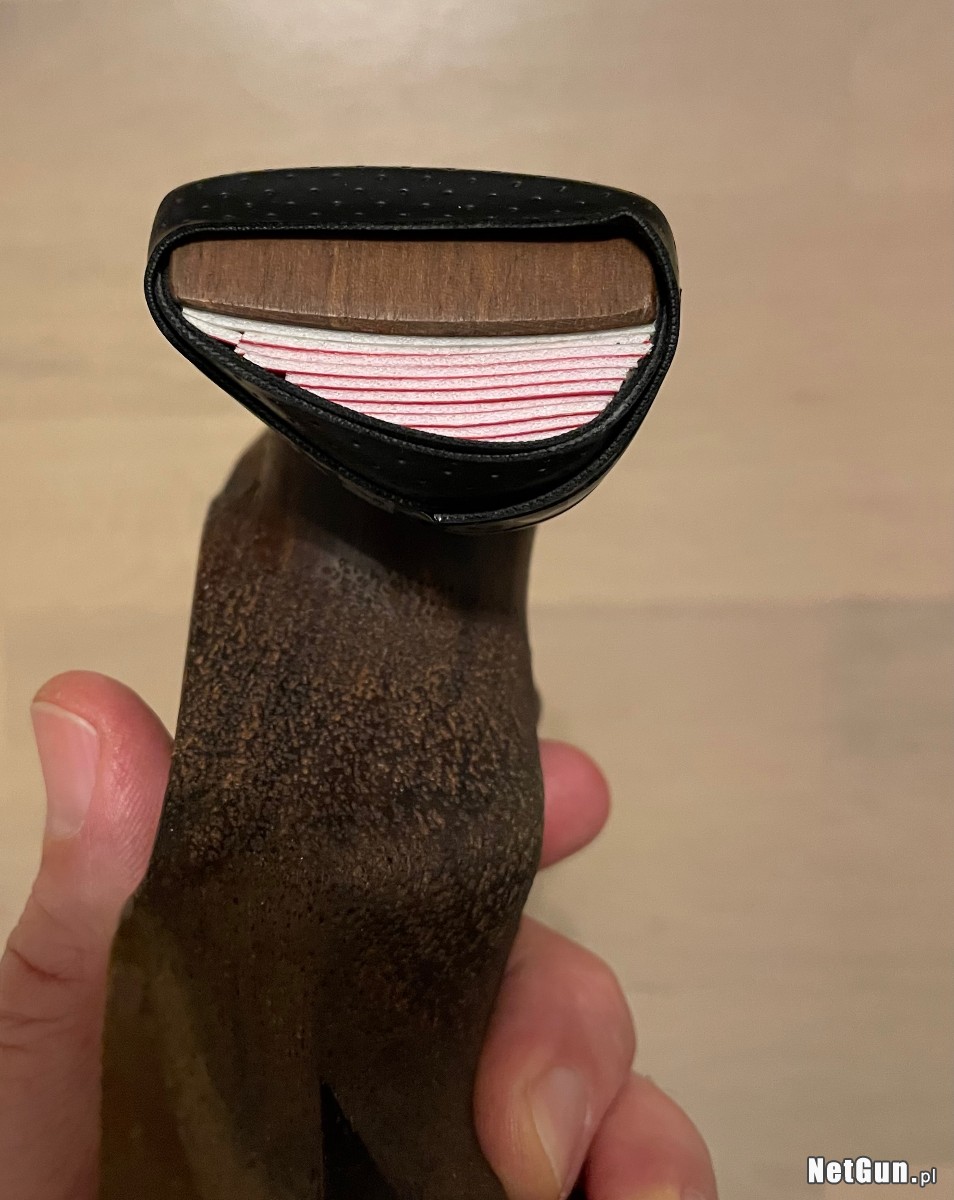 W celu lepszego dopasowania rękojeści dwa swojej ręki (rozmiar M) dokleiłem kilka warstw taśmy dwustronnie klejącej i owinąłem to owijką z rakiety od badmintona. Wszystko w pełni odwracalne. Nie zdjąłem do zdjęć, bo może nowemu właścicielowi podpasuje.