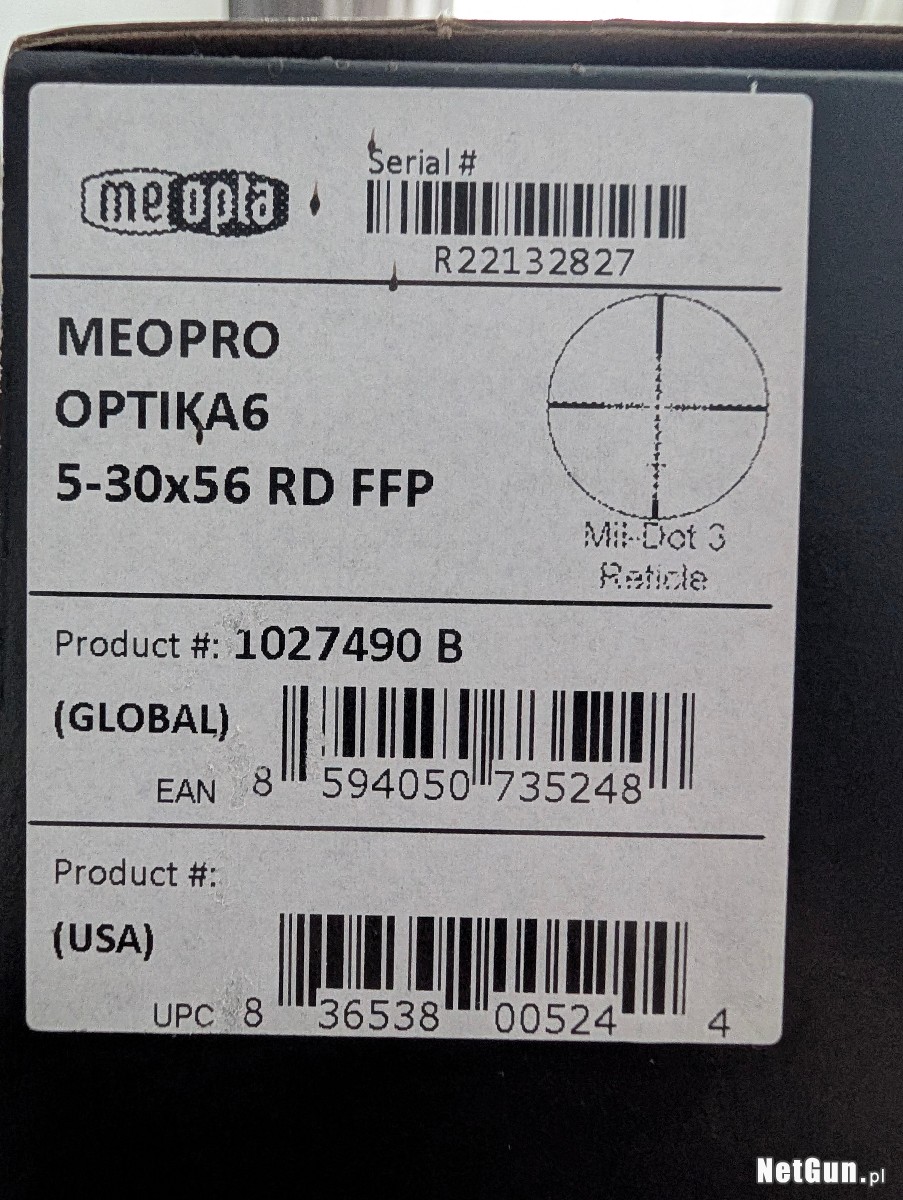 - lunetę Meopta Optika6 5-30x56 Mil-Dot 3 FFP z killflash (nie do zdobycia obecnie ;) ) - od nowości na karabinie - stan IDEALNY - 4000pln