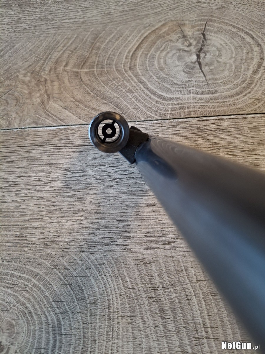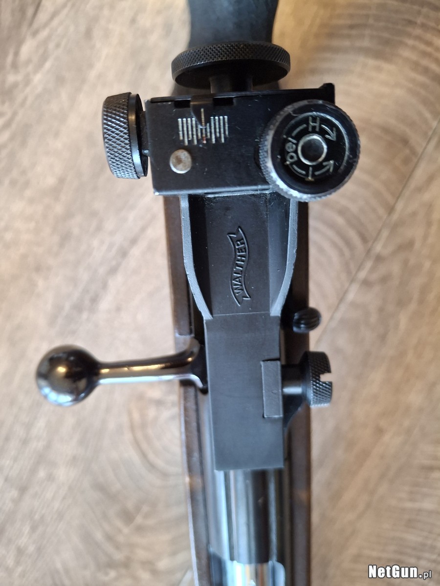 Przyrządy celownicze to muszka tunelowa i 10-klikowy diopter (celownik przeziernikowy) firmy Walther.