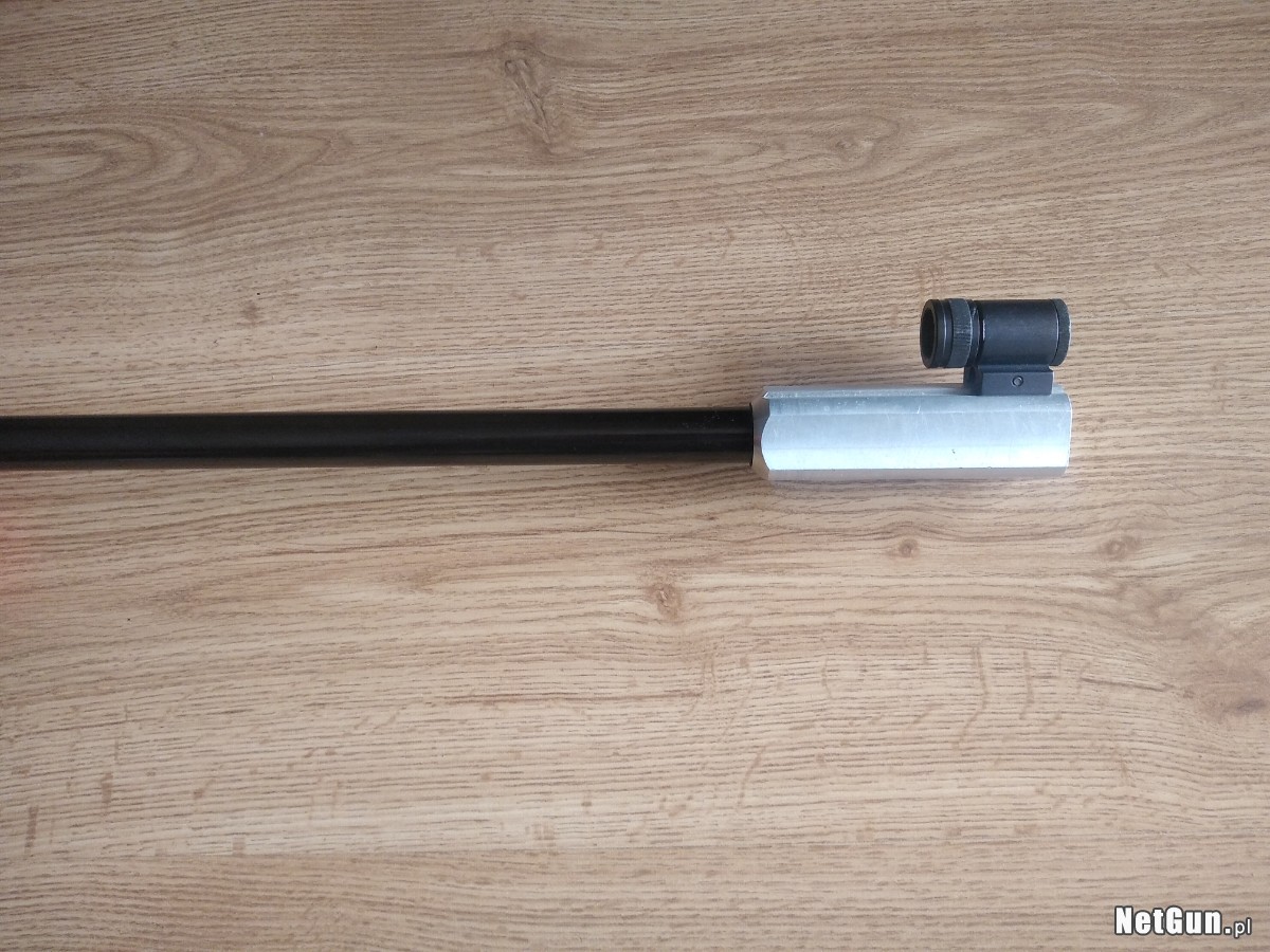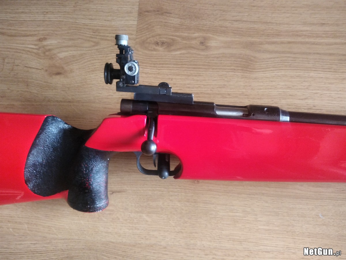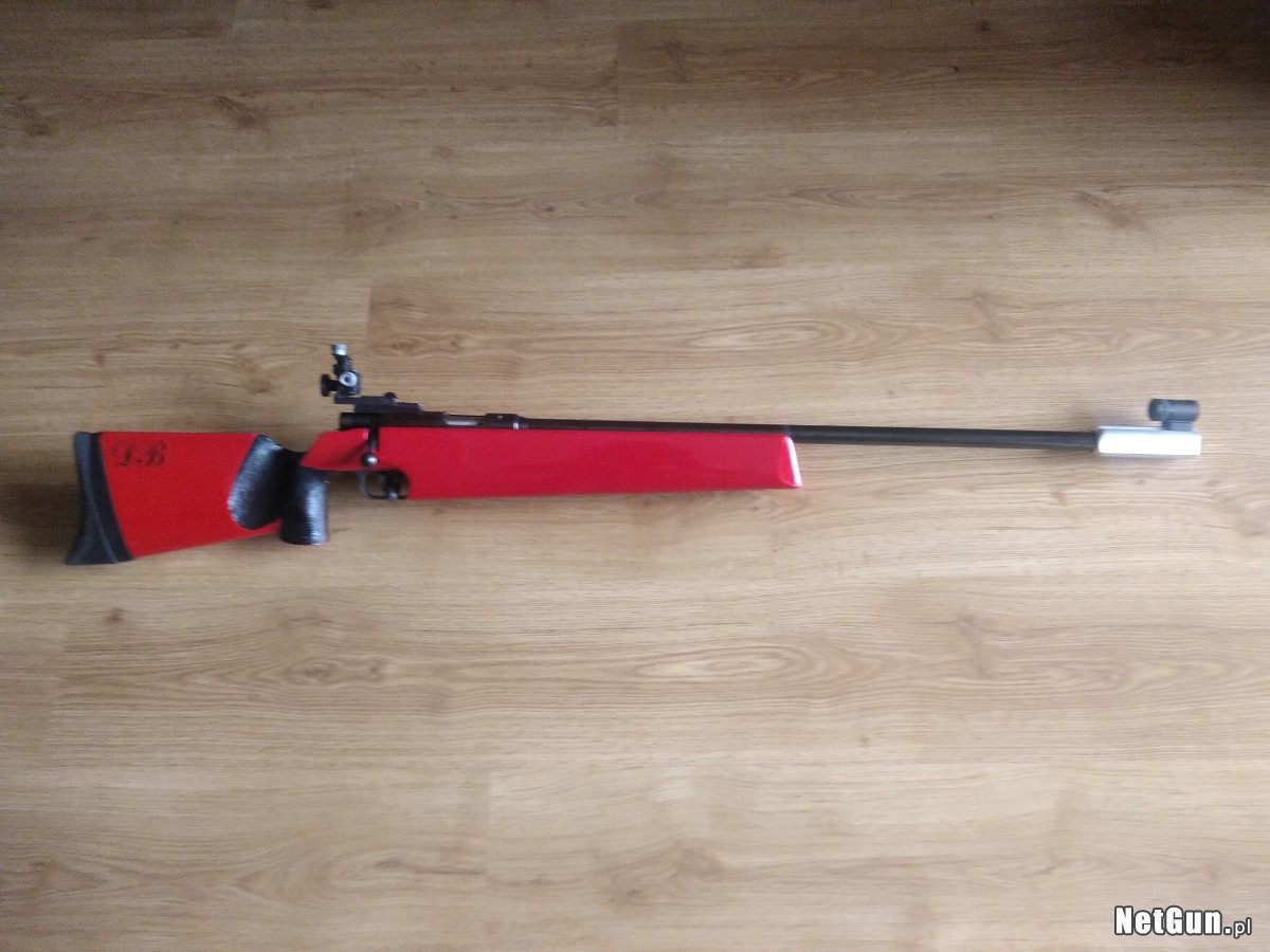 Anschutz Match 54 kal 22lr po modernizacji. Osada lakierowana w kolorze czerwonym, stopka od modelu 1907, przedłużona linia celowania, mucha tunelowa 22 mm. Karabinek strzela doskonale. Możliwość dowozu.