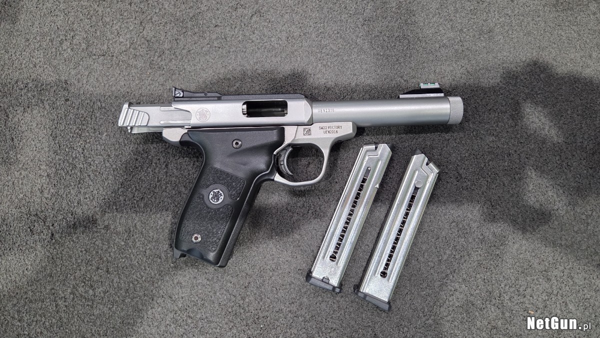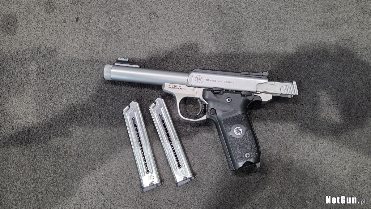 Mamy na sprzedaż pistolet Smith & Wesson MOD. SW22 VICTORY TARGET w kalibrze .22LR. Używana była do prowadzenia szkoleń na terenie klubu strzeleckiego, głównie przygotowań pod patent strzelecki. Nastrzał pistoletu nie jest znany i raczej nie możliwy do ustalenia, ale jest zdecydowanie wysoki - stąd niska cena. Broń jest w stanie poprawnym - gwint w lufie jest wyraźny, nie zmatowiony, korona lufy również jest okej, części mechaniczne broni noszą ślady użytkowania - widać że broń pracowała, ale nie ma uszczerbków ani innych wykruszeń. Broń ma mały luz na zamku od nastrzału.
