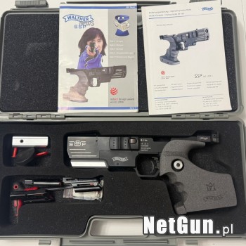 Walther SSP .22lr., rękojeść prawa duże M. Przelot około 600. Bogaty zestaw: 3 magazynki, flaga, dwa ciężarki, zbijak do treningu na sucho.