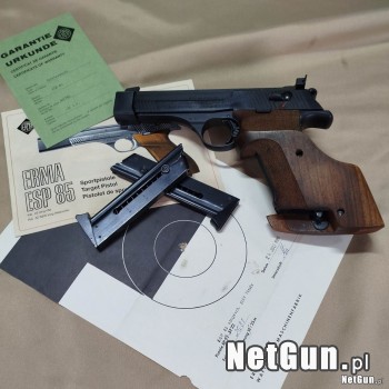 Pistolet sportowy bocznego zapłonu Erma, Mod. ESP 85A, kal. .22lr. Wspaniały, precyzyjny pistolet sportowy - w pełni stalowa konstrukcja, nieruchoma szyna muszka-szczerbinka, anatomiczna, regulowana rękojeść oraz możliwość treningu na sucho. Stan ogólny bardzo dobry z lekkim minusem minus. Oksy...