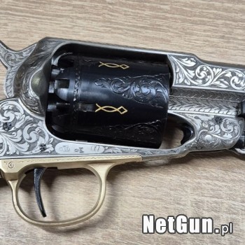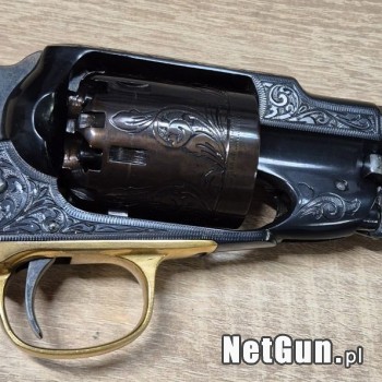 Rewolwer czarnoprochowy Remington New Model Army 1858. kal. .44BP Produkcja włoska - Wike-Rigarmi Wersja pięknie grawerowana i zdobiona fabrycznie. Stan techniczny BDB Rewelacyjna sztuka, polecam do kolekcji lub na prezent.