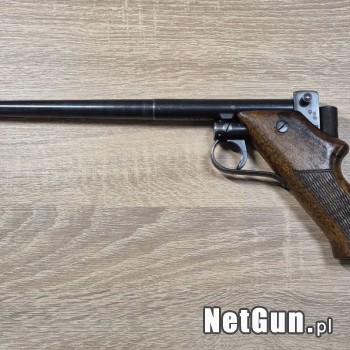 Jednostrzałowy pistolet bocznego zapłonu PAV model 50. Produkcja czechosłowacka - 1952r. Stan techniczny BDB, wizualny dostateczny. Widoczne braki w drewnianym chwycie oraz poprzecieraną oksydę. Lufa długości 283mm.