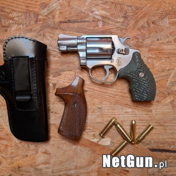 S&W model 60 .38Special w wersji z krótką lufą 1,875". Uwaga, jest to pierwsza seria bez tzw. daszka w numeracji (no dash), wyprodukowana w 1969 roku, sprowadzona i zoptymalizowana pod względem działania przez zakład rusznikarski z Langenzenn. Rewolwer wyposażony w chwyt G10 od VZ Grips, kaburę...