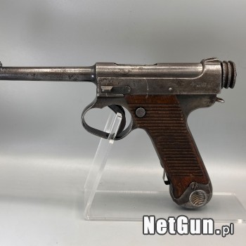 Japoński pistolet Nambu typ 14 z grudnia 1943 roku kaliber 8mm Nambu. Cena za sam pistolet!!! Fotografie robione w mocnym świetle, przez to wszystkie szczegóły na czarnym podłożu są przesadnie widoczne, natomiast na srebrnych błyszczących elementach możliwe są odbicia oświetlenia diodowego. Warto...
