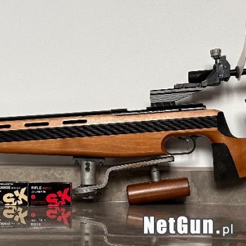 Karabin sportowy marki Anschutz, model 1903, kaliber 22LR, rok produkcji 2002. Pełny zestaw do stójki z regulowanym otworem muszki i przeziernika, z podwyższeniem linii celowania oraz z ciężarkami - karabin wyważony, z hakiem i grzybkiem. Wszystko to co na fotografiach. Stan bdb. Wymagane zezwolenie...