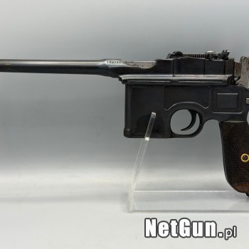 Pistolet Mauser C96 z 1915 roku w typowym dla niego kalibrze 7,63x25mm, w pełni zgodny numerycznie ( nawet obie okładki ). Dokupiona oryginalna kaburokolba z inną końcówką numeru seryjnego + 2.500pln. Stan wewnętrzny idealny, lufa zmatowiała ale z głębokim i wyraźnym gwintem, zewnątrz podprawiany w...