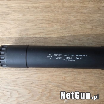 B&T Monoblock kal. do 6,2mm/.243'' + adapter 1/2''-28 UNEF Nr Katalogowy: SD-988316-1 , Kaliber: do 6,2mm / .243'' , dł. 238mm, śr. 50mm, waga: 540g. Przebieg około 400 szt. Urządzenie wylotowe Monoblock jest przeznaczone dla myśliwych lub strzelców precyzyjnych na duże odległości. Monoblock jest...