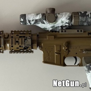 Karabinek Stag Arms 15 M4, Wylde (5,56 i .223), długość lufy 16”. Malowany przez profesjonalistę lakierem (podkład, baza i lakier z palety Glock 19X Coyote). Farba zeszła jedynie przy muszce, gdy chciałem ją zdjąć. Wystrzelane około 800 szt. W zestawie to co na zdjęciu - kolba Magnum PRS Lite Stock...