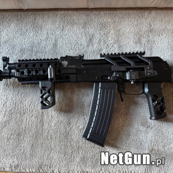 Mini Jack Taktyczny w kalibrze 223 Rem / 5,56x45 Przebieg jest bardzo niski około 300 - 400 Karabin wyposażony jest w uchwyty KRUK, posiadam też oryginalne. Nowy w tym wyposażeniu kosztuje 6 600 zl