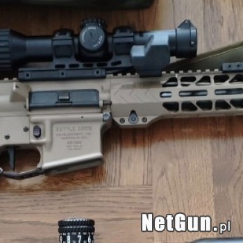Karabinek z 16 calową lufą. Sprężyna powrotną z drutu płaskiego, tłumik veles Arms gen 2, hamulec wylotowy jcomp, obustronna dźwignia przeładowania tbone, obustronny bezpiecznik, spust mimtac drastic, biegówka Vector optics Continental, kolba prs lite, magi 10, 30 co kto chce.