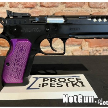 Pistolet do IPSC w klasie production / production optics. Pistolet w wersji Large frame dla osób ceniących sobie pełniejszy chwyt. W zestawie akcesoryjne okłądziny w kolorze purpurowym