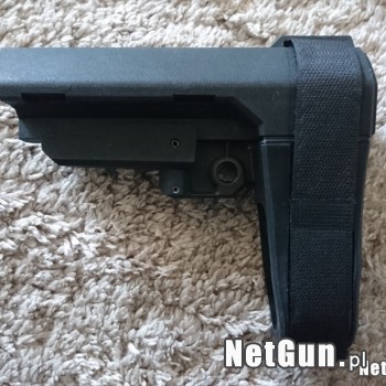 W ofercie kolba typu brace SB Tactical model SBA3 Nieużywana, zdjęcia z karabinka. Przedstawiony pasek można umiejscowić w dowolnym miejscu obwodu. Pięć pozycji regulacji długości, zgodna z każdym buffer tube w standardzie AR15 / Mil-Spec