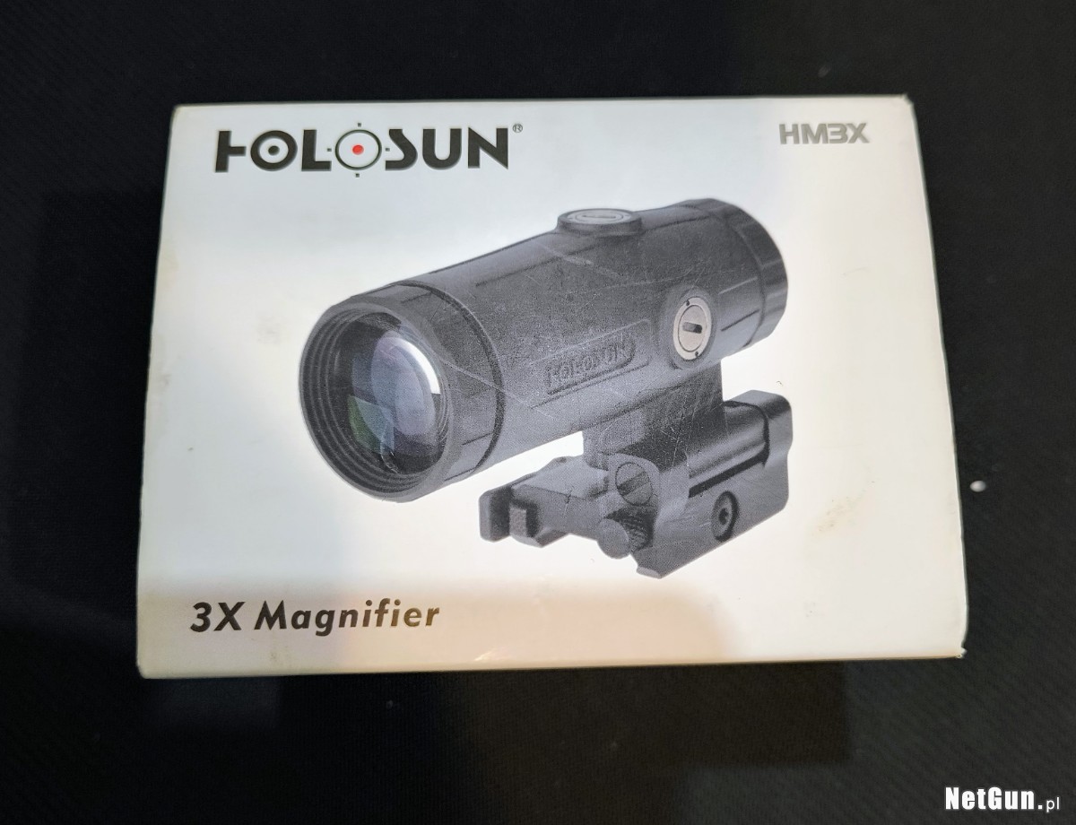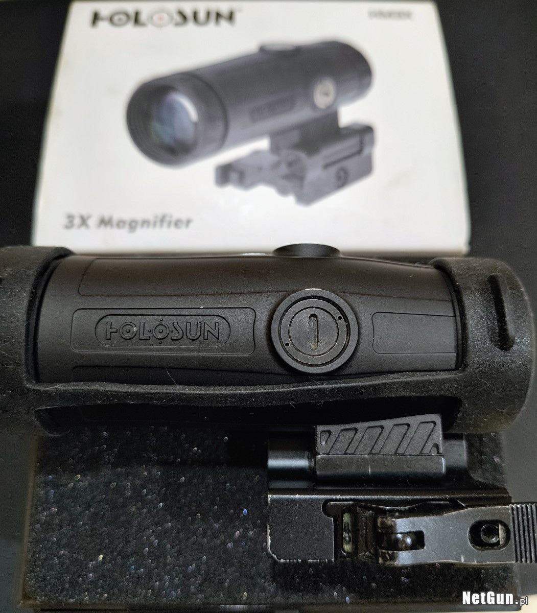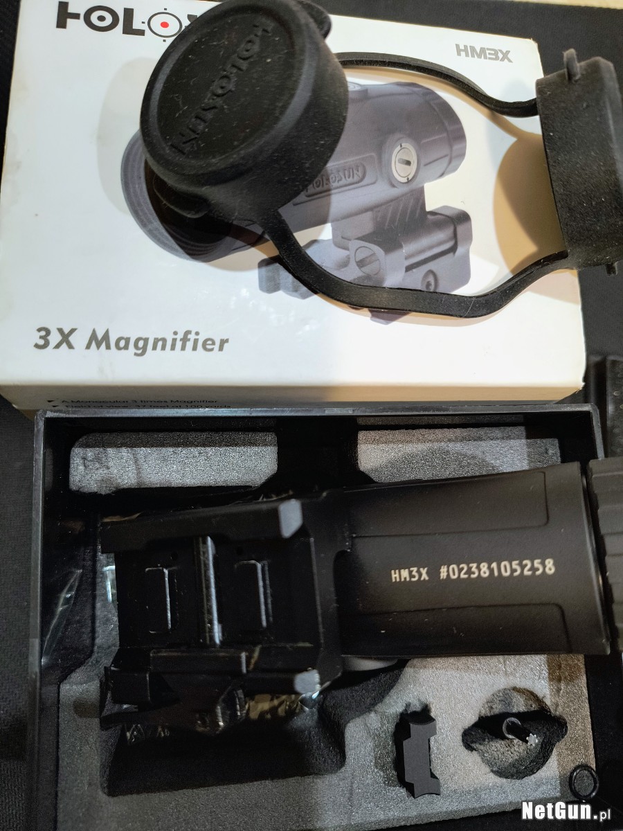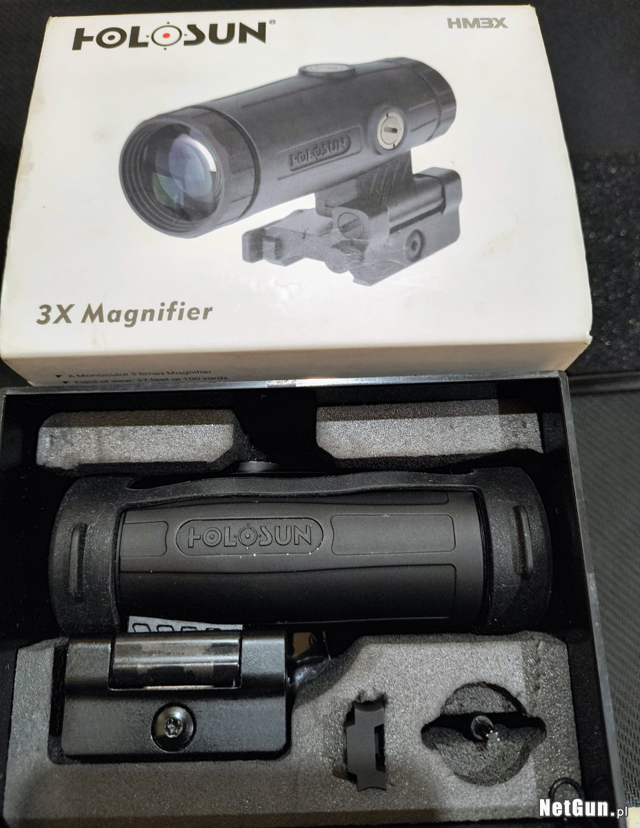Używany w bardzo dobrym stanie, niewielkie ślady otarć, drobne ryski. Powiększalnik do kolimatora HM3X typu Flip-Up od firmy Holosun. Po nasunięciu na wysokość celownika zapewnia stałe powiększenie optyczne rzędu 3x. Dzięki niemu można zamienić kolimator w lunetę o małym przybliżeniu. Co odróżnia jednak taki zestaw od lunety, jest to, że w razie potrzeby wystarczyć odsunąć powiększalnik i znowu do dyspozycji jest właściwy celownik.