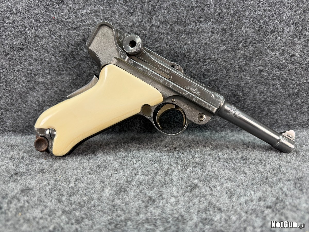 Pistolet P08 z edycji limitowanej z 1983 roku. Grawerowany fabrycznie. Piękne jasne chwyty. Był własnością Franza Josefa Straussa - premiera Bawarii od listopada 1978 do października 1988 roku. Po jego śmierci w rękach jego syna. Teraz trafił w nasze ręce.