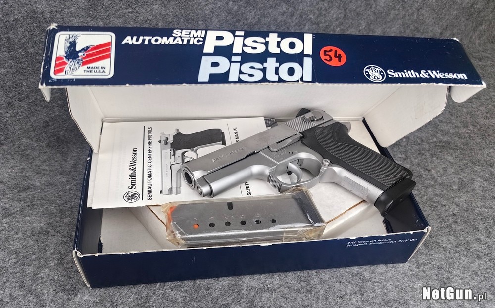 Pistolet samopowtarzalny S&W mod. 4516, kal. 45ACP. Pistolet w pełnym fabrycznym komplecie: pistolet, dodatkowy magazynek, flaga bezpieczeństwa, karta gwarancyjna, instrukcja obsługi, oryginalne opakowanie.