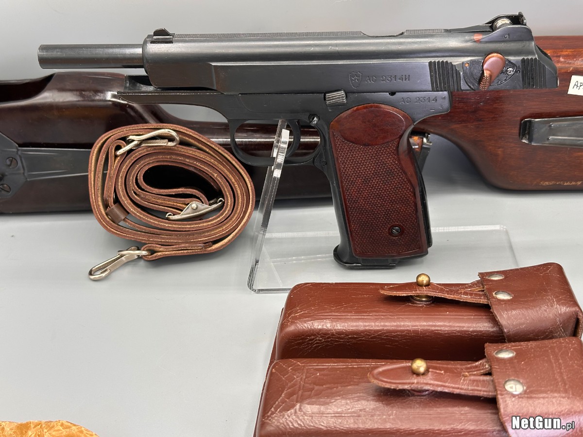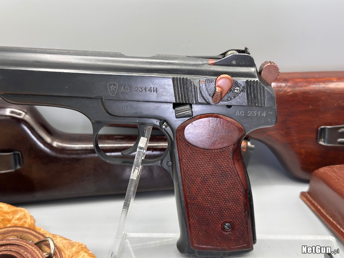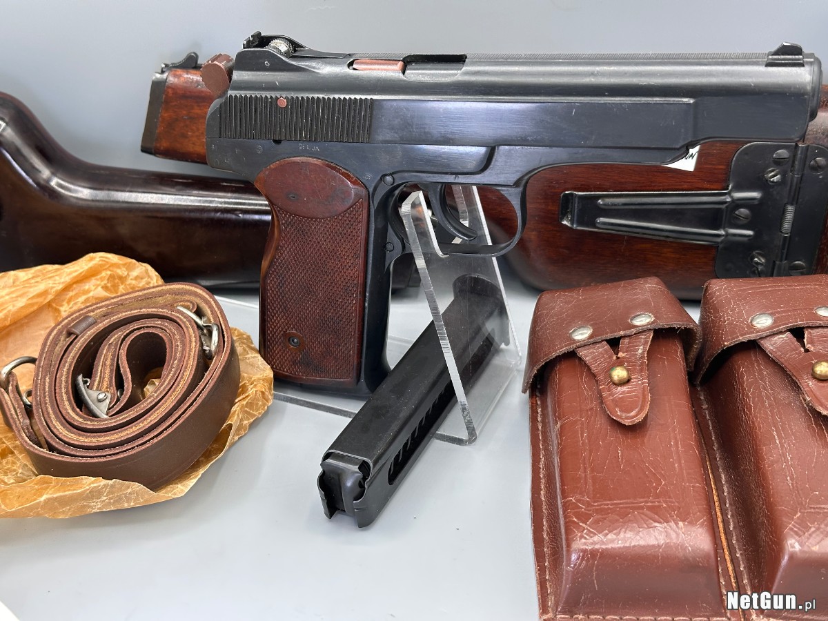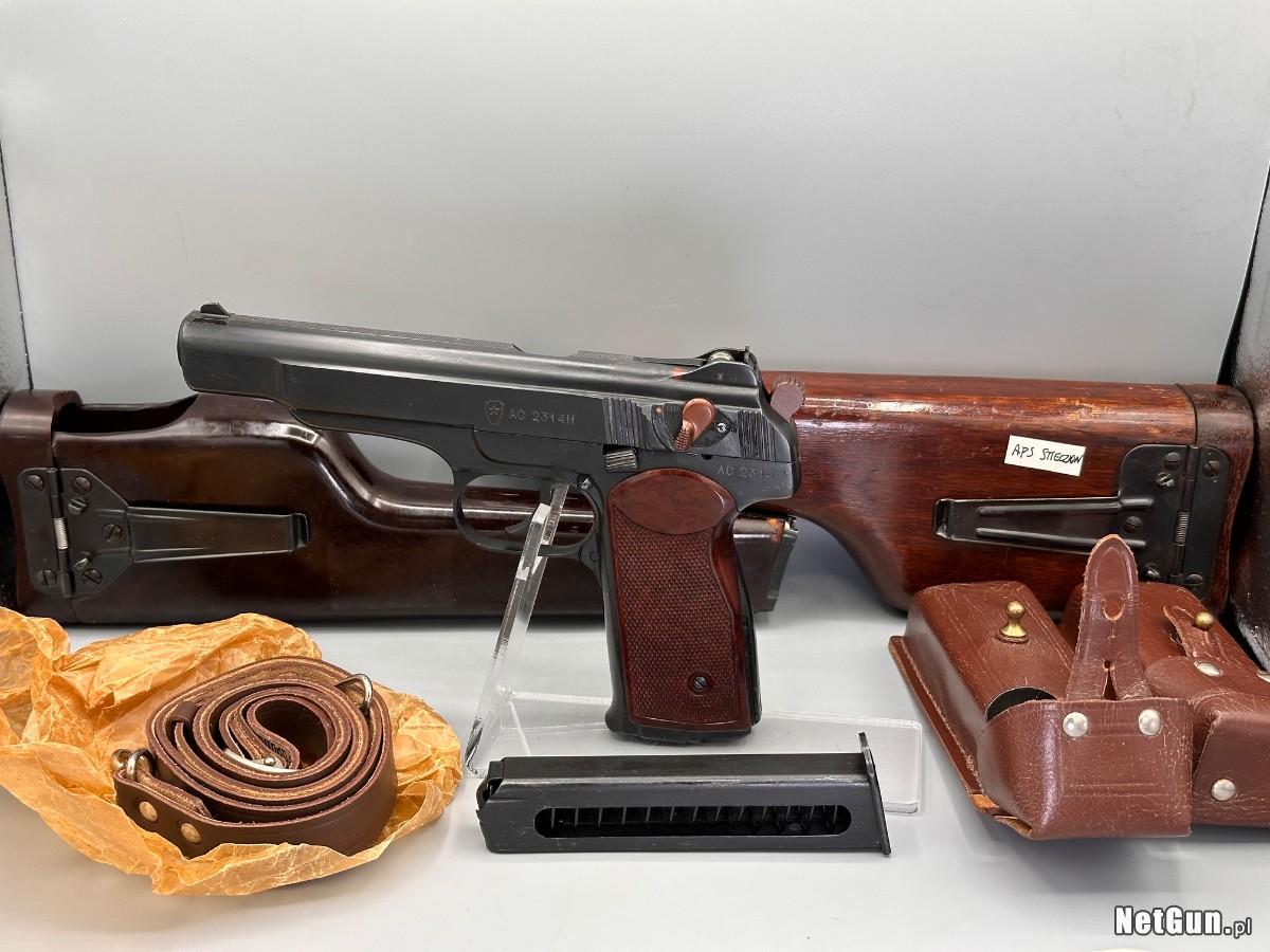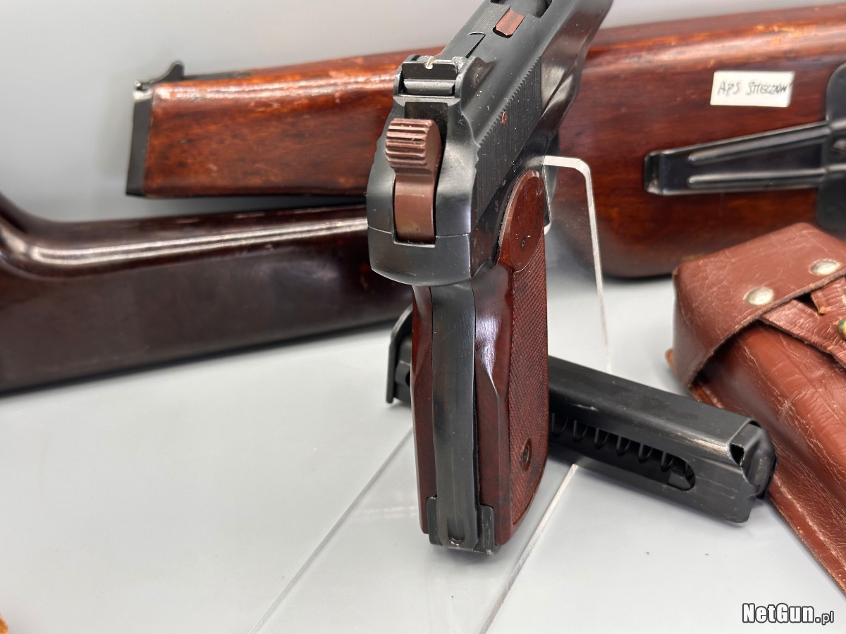 Kompletny zestaw w bdb stanie APS Stieczkin kal 9mm Makarov . Z drewnianą kaburokolbą i magazynkami. Trudno znaleźć w lepszym stanie i ukompletowany.