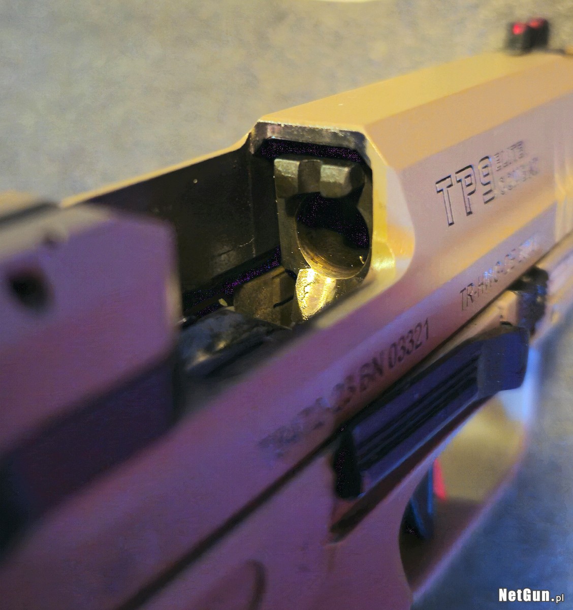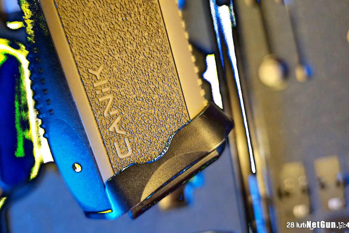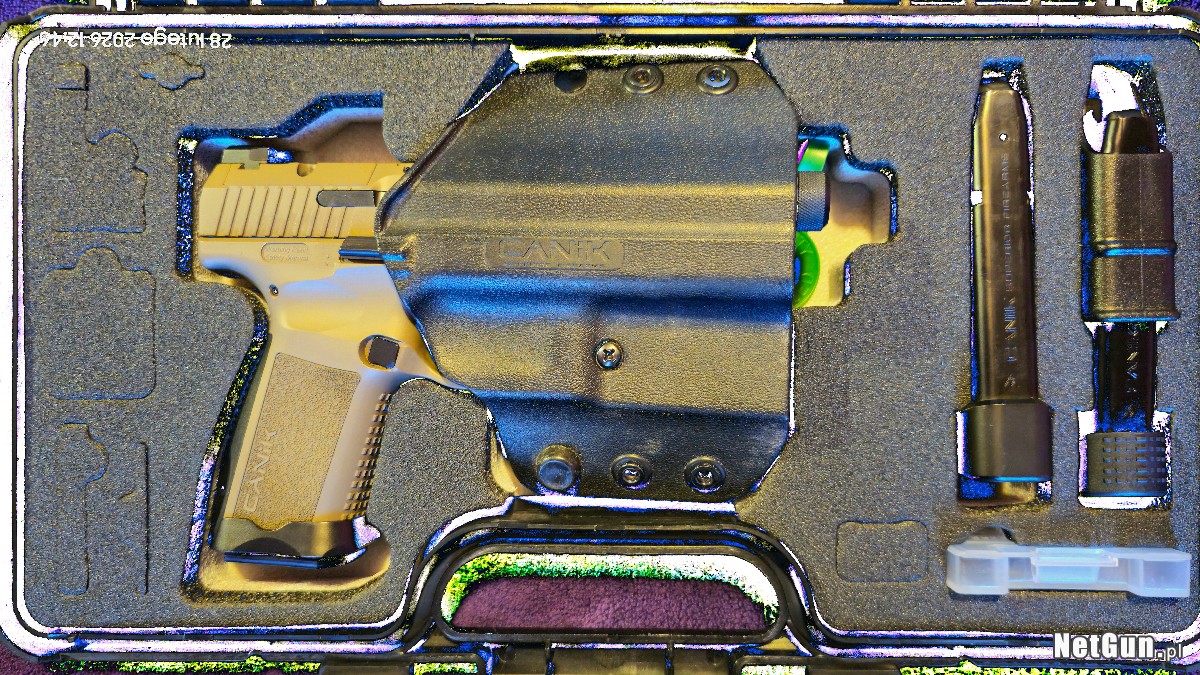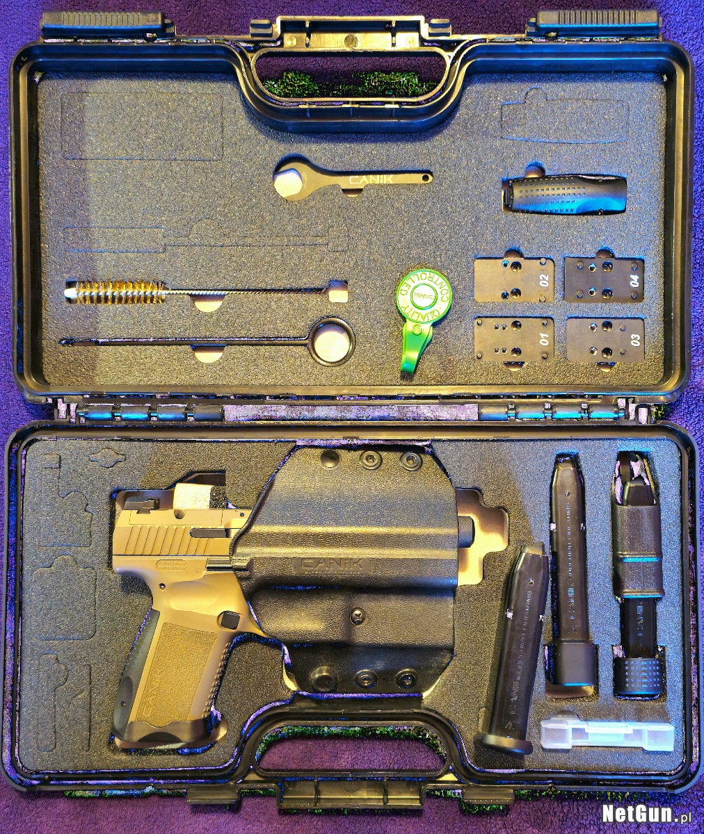 Zestaw fabryczny (dokumenty, pudełko, narzędzia, kluczyk, czyścidła, płytki pod optykę, ładownica, kabura, 3 magazynki, zmienne nakładki na rękojeść, magwell).