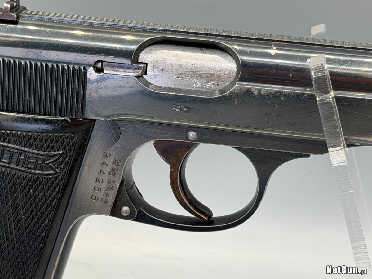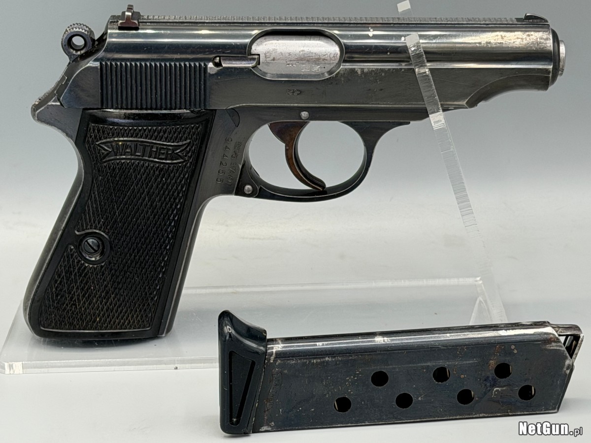Bardzo ładnie zachowany pistolet Walther model PP z bezpiecznikiem 90 stopni. Z prywatnej kolekcji. Lufa lustro. Fotografie robione są w mocnym świetle, przez to wszystkie szczegóły na czarnym podłożu są przesadnie widoczne, natomiast na srebrnych błyszczących elementach możliwe są odbicia oświetlenia diodowego. Warto czytać opis albo dopytać, gdy coś budzi wątpliwości. Dopóki widzisz tą ofertę tzn, że jest aktualna ( na bieżąco usuwam po sprzedaży czy rezerwacji).