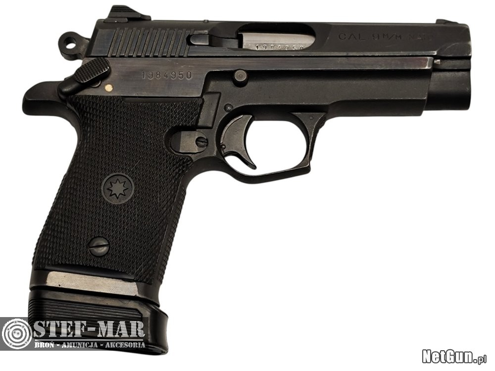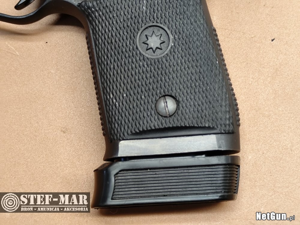 Solidnie zbudowany,kompaktowy pistolet,przeznaczony do samoobrony.Broń bardzo stabilna,o małym odrzucie,niezawodna i precyzyjna,o smukłym chwycie i wysokiej ergonomii.Prezentowany egzemplarz zachowany w stanie b.dobrym.