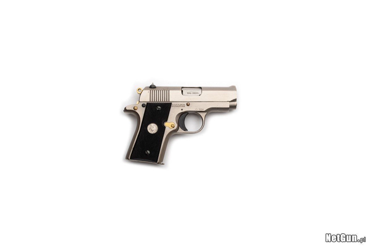 Pistolet samopowtarzalny centralnego zapłonu Colt Mod. Mustang MK IV Series 80, kal. 9mm Browning Court / .380ACP. Wprowadzona na rynek w 1986r. kompaktowa wersja modelu 1911, zaprojektowana do skrytego noszenia. W porównaniu do pełnowymiarowego 1911, nie posiada tulei lufy i bezpicznika chwytowego, ale jest wyposażony w wewnątrzną blokadę iglicy, która chroni przed przypadkowym strzałem przy upadku broni. Bardzo rzadki egzemplarz z pierwszego roku produkcji, z prestiżowej edycji jubileuszowej z okazji 150-lecia firmy Colt, wyróżniający się szampańskim odcieniem (odcień jest bardzo subtelny, na zdjęciach wyolbrzymiony techniką wykonania zdjęć i trudnościami z odwzorowaniem lustrzanych powierzchni), złoconymi elementami (tlenek tytanu) i okolicznościowym medalionem ze zmienionym koniem i liczbą 150, która upamiętnia rok 1836, w którym Samuel Colt otrzymał swój pierszy patent na rewolwer.