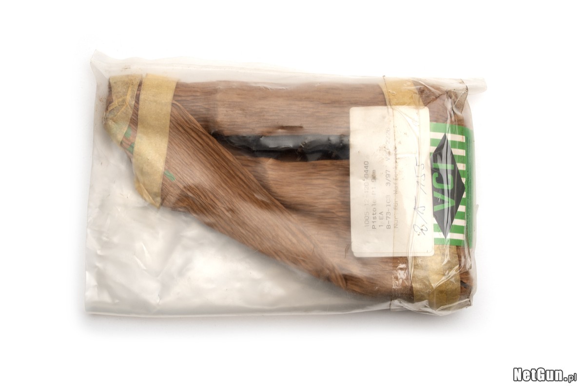 Pistolet samopowtarzalny centralnego zapłonu Walther Mod. P1, kal. 9x19. Unikatowy egzemplarz pistoletu P1, podstawowego pistoletu armii RFN w latach 1963-1996, pochodzący z zapasów mobilizacyjnych Bundeswehry w kompletnym, jednostkowym pakiecie przygotowanym do wydania bezpośrednio z magazynu. Oferta jak z przysłowiowym kotem w worku - pistolet oferowany tak, jak widoczny na zdjęciu - zapakowany, bez możliwości rozpakowania podczas zakupu. Przyszły właściciel raczej również nie będzie chciał go rozpakowywać bowiem fabryczne pakowanie ma ogromną wartość kolekcjonerską i rozpakowanie wiąże się z utratą wartości nawet o 30%. Pistolet jest owinięty perforowanym papierem w taki sposób, że widoczne jest tylko małe okienko rewizyjne z numerem seryjnym i zapakowany w technologii VCI - zaawansowane rozwiązanie opakowaniowe, które chroni metalowe przedmioty przed korozją bez konieczności stosowania smarów czy olejów. Technologia ta opiera się na uwalnianiu inhibitorów chemicznych z materiału opakowaniowego do wnętrza szczelnie zamkniętego worka. Cząsteczki osadzają się na powierzchni metalu, tworząc niewidoczną, monomolekularną warstwę ochronną. Warstwa ta przerywa reakcje elektrochemiczne wywoływane przez wilgoć i tlen, skutecznie blokując powstawanie rdzy. Elementy wyjęte z woreczka są suche i czyste bez czasochłonnego odtłuszczania - warstwa ochronna odparowuje z metalu w ciągu kilku godzin, nie pozostawiając żadnych śladów. Podgląd przez okienko rewizyjne zdradza fabryczny stan i pozwala sądzić, że podobnie jest w pozostałej, niewidocznej części.