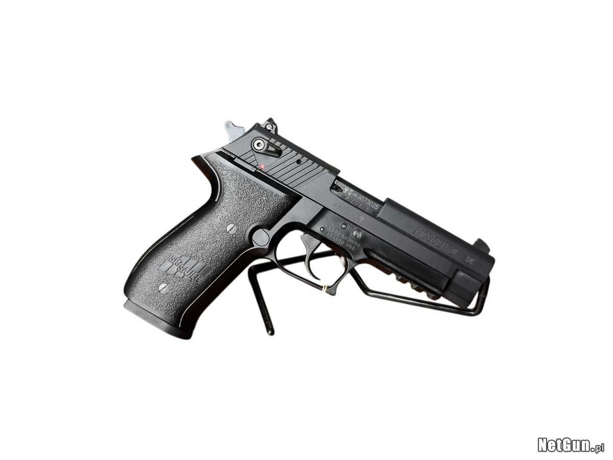 Pistolet samopowtarzalny Sig Sauer Mosquito to niemiecka broń treningowo-rekreacyjna w kalibrze .22 LR zaprojektowana jako pomniejszona wersja pistoletu Sig Sauer P226. Model ten powstał z myślą o tanim treningu, nauce strzelania oraz rekreacji, zachowując ergonomię i obsługę zbliżoną do pełnowymiarowych pistoletów Sig Sauer używanych przez wojsko i policję na całym świecie. Konstrukcja oparta jest na zamku swobodnym, posiada manualny bezpiecznik oraz wygodny chwyt. Dzięki niewielkiemu odrzutowi i dobrej ergonomii pistolet jest bardzo przyjemny w strzelaniu. W zestawie oryginalne pudełko. Stan: Bardzo dobry