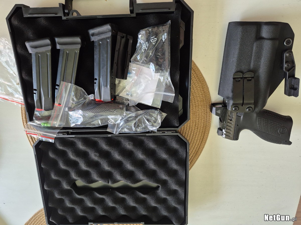 Komplet akcesoriów fabrycznych: 3 magazynki, wymienne nakładki chwytu, pudełko transportowe oraz pozostała dokumentacja/akcesoria widoczne na zdjęciu.