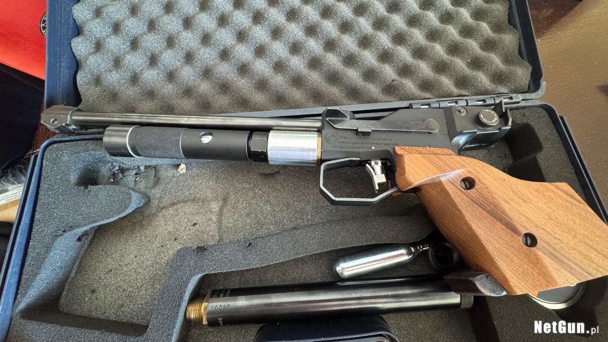 Feinwerkbau Mod.2 w zestawie oryginalny kartusz , konwesja na kapsułki CO2 12 g (Bardzo wygodny system 30-40 strzałów za 1 zł) , redukcja do napełniania CO2 oraz walizka