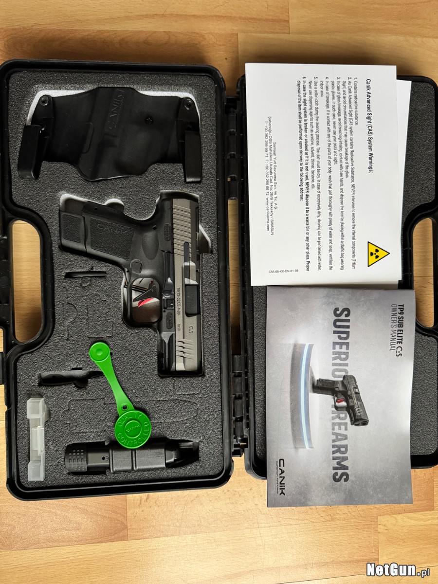 Sprzedam pistolet Canik TP9 Sub Elite CAS Tungsten Grey (rok produkcji 2022) w moim posiadaniu od 10.2023, pistolet zakupiony w sklepie. Pistolet posiada 3,6 calową lufę. Posiada dwa dwurzędowe magazynki mogące pomieścić do 12 i 15 sztuk amunicji, przednie i tylne frezowanie zamka, obustronne manipulatory i kaburę do skrytego noszenia z możliwością montażu po obu stronach paska (OWB lub IWB).