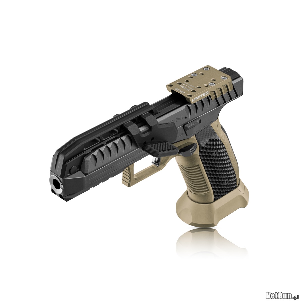 - Pistolet z zamkiem Limited Optics z montażem umożliwiającym założenie różnych modeli kolimatorów,