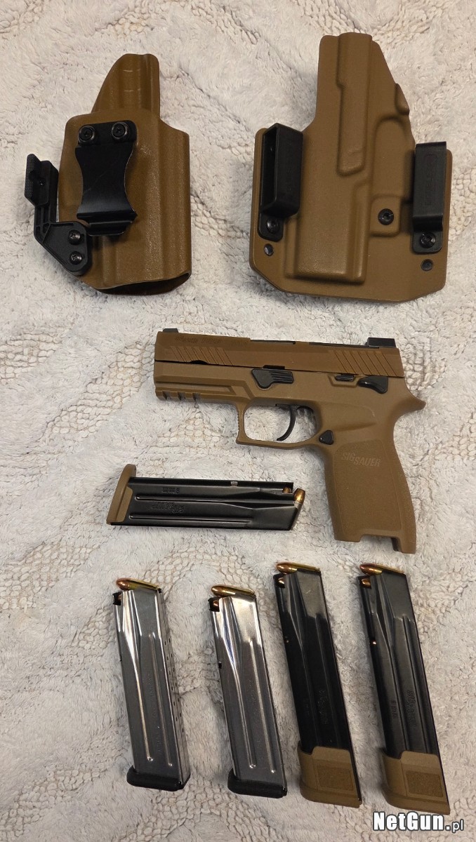 Mam do sprzedania pistolet 9x19mm firmy Sig Sauer, model P320 M18. Rok produkcji 2024, zakupiony w 2025, jestem pierwszym właścicielem. Stan bardzo dobry, przebieg szacuję na 600-700 strzałów. Oryginalnie w zestawie jest magazynek 17 naboi oraz dwa po 21 naboi - dorzucam dwa dodatkowe po 17 oraz dwie kabury - zewnętrzna DoubleTap oraz wewnętrzna (AIWB - Appendix Inside the Waistband) z firmy Love4Guns.